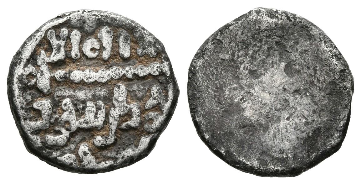 TAIFAS ALMORAVIDES. Acuñaciones inciertas. 1/2 Quirate. Anónimo. F. Benito de los Mozos cita un ejemplar de 1/8 Quirate con una distribución similar en anverso. Vives 2008var; Kassis 15var; F. Benito de los Mozos V10var. Ar. 0,54g. MBC. Muy rara.