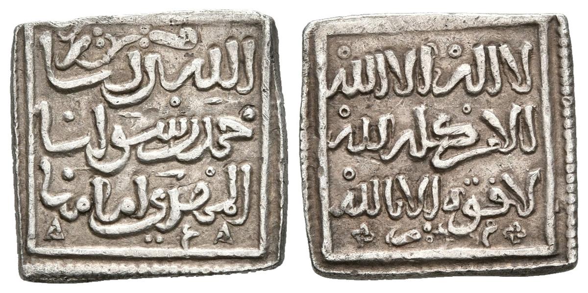 ALMOHADES. Dirham. Anónimo, citando a Al-Mahdi. Variante de decoración en ambas caras. Vives 2088; Hazard 1101. Ar. 1,53g. EBC.