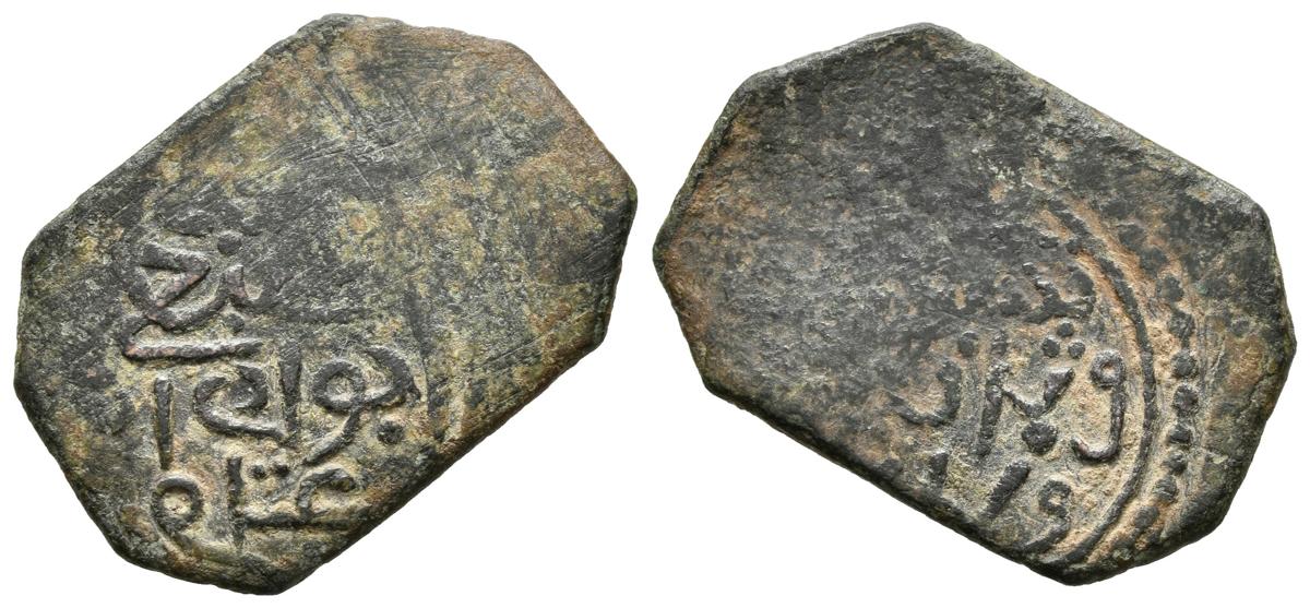 REINO DE GRANADA. Nasrids. Felus. 889 H. Wadi ash (Guadix). Año desconocido para esta rara ceca cuyas acuñaciones anónimas se atribuyen a Muhammad XII. Vives No cita; Lorente no cita. Ae. 2,53g. MBC-. Muy rara.