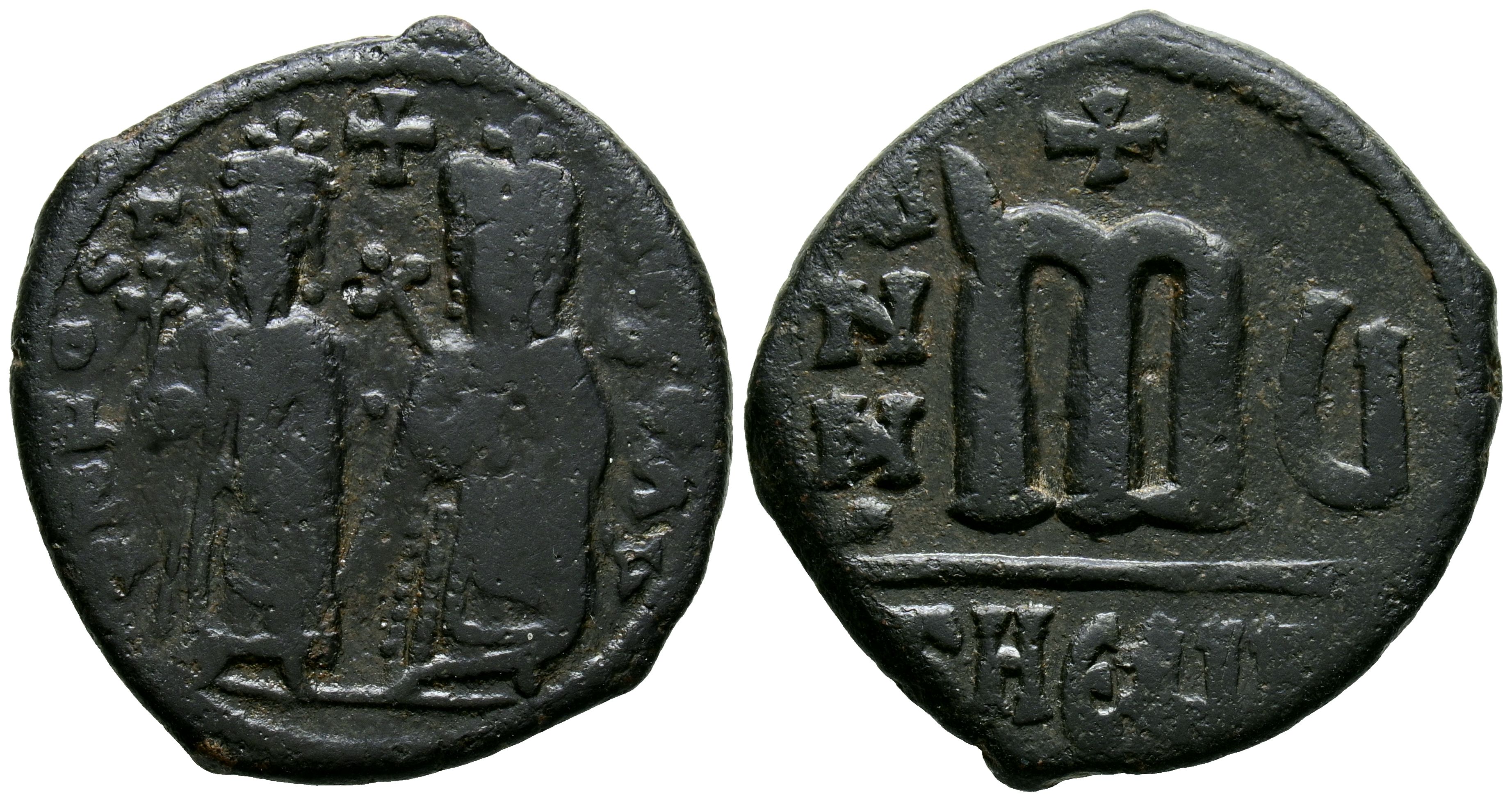 FOCAS. Follis (Ae. 9,05g/27mm). 602-610 d.C. Theupolis (Antioquía). (Seaby 671). Anv: Focas y Leoncia coronados y estantes portando simbolos sacro-imperiales; sobre ellos cruz, alrededor leyenda: D N FOCA - NE PE AV. Rev: M grande entre ANNO - U; encima cruz; en exergo: THEUP'. BC+.