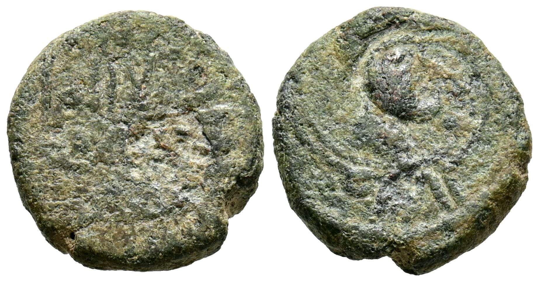 EMIRATO DEPENDIENTE DE CÓRDOBA, PERIODO DE GOBERNADORES. Anónimo. Felús. (Ae. 1,85g/13mm). S/D. (Frochoso XIV-a; Walker-Th12). Anv: 'Sahada' en tres líneas rodeada de una gráfila de hojas. Rev: Cabeza de guerrero a derecha, alrededor misión porfética de Muhammad. MBC/BC+.