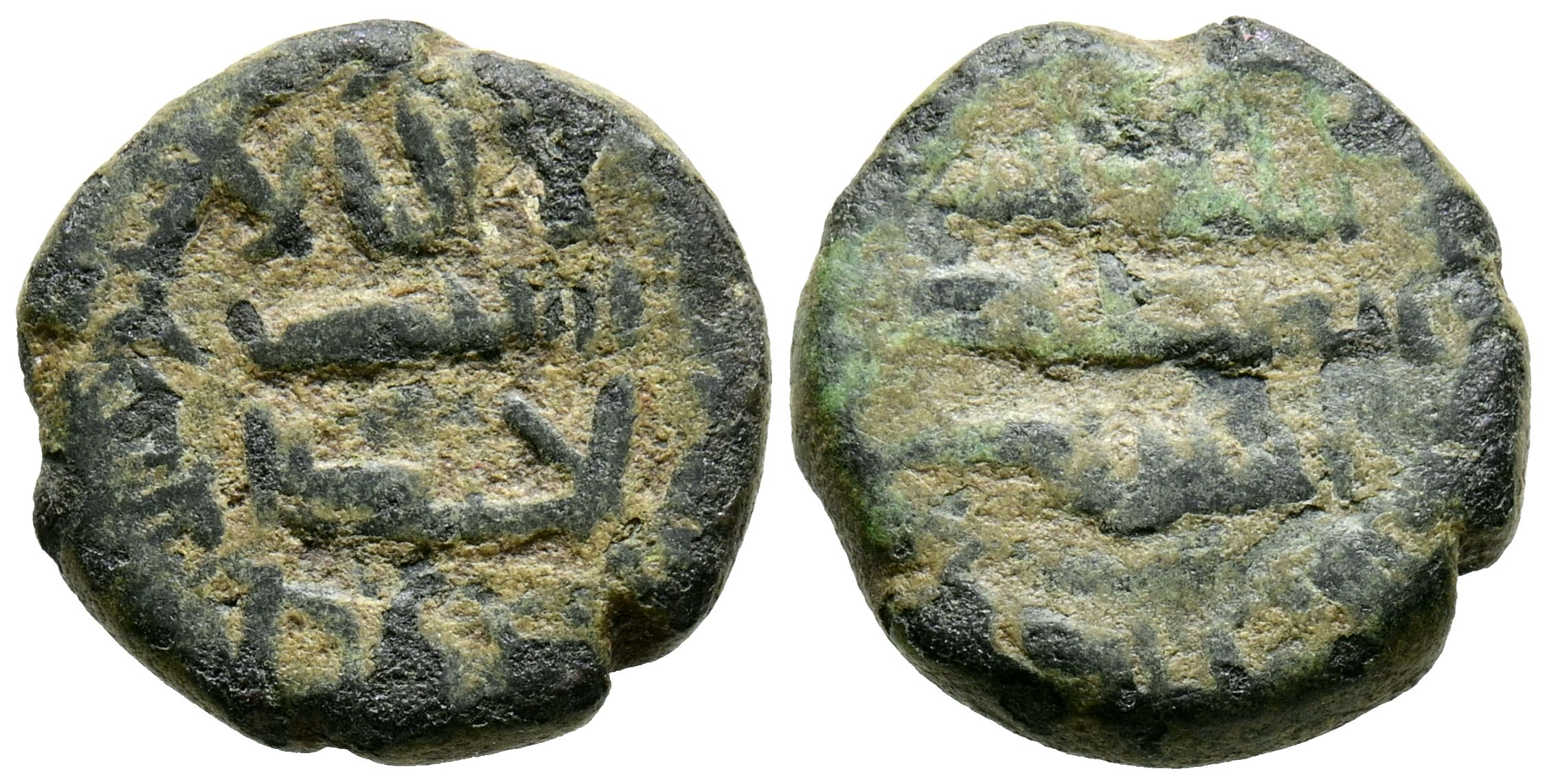 EMIRATO DEPENDIENTE DE CÓRDOBA, PERIODO DE GOBERNADORES. Anónimo. Felús. (Ar. 3,86g/15mm). 1¿XX?H. al-Ándalus / الاندلس. (Frochoso XX-b). Anv: لا شرك له / الله وحده / لا اله الا. Rev: لم يولد / الله أزلي / الله واحد. (Dios es uno / Dios es eterno / Y no fue engendrado). Parte de las orlas visible en ambas áreas. MBC-.