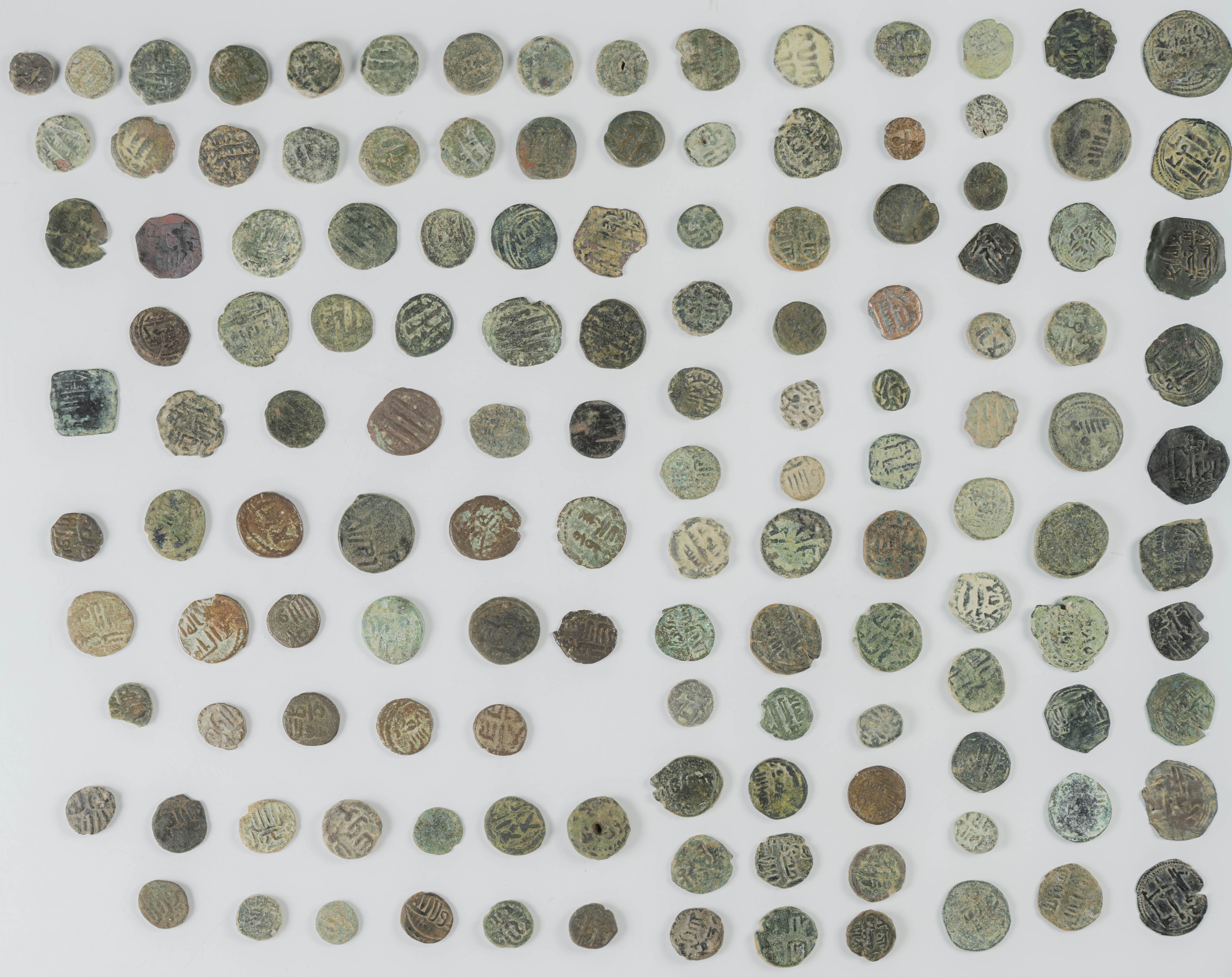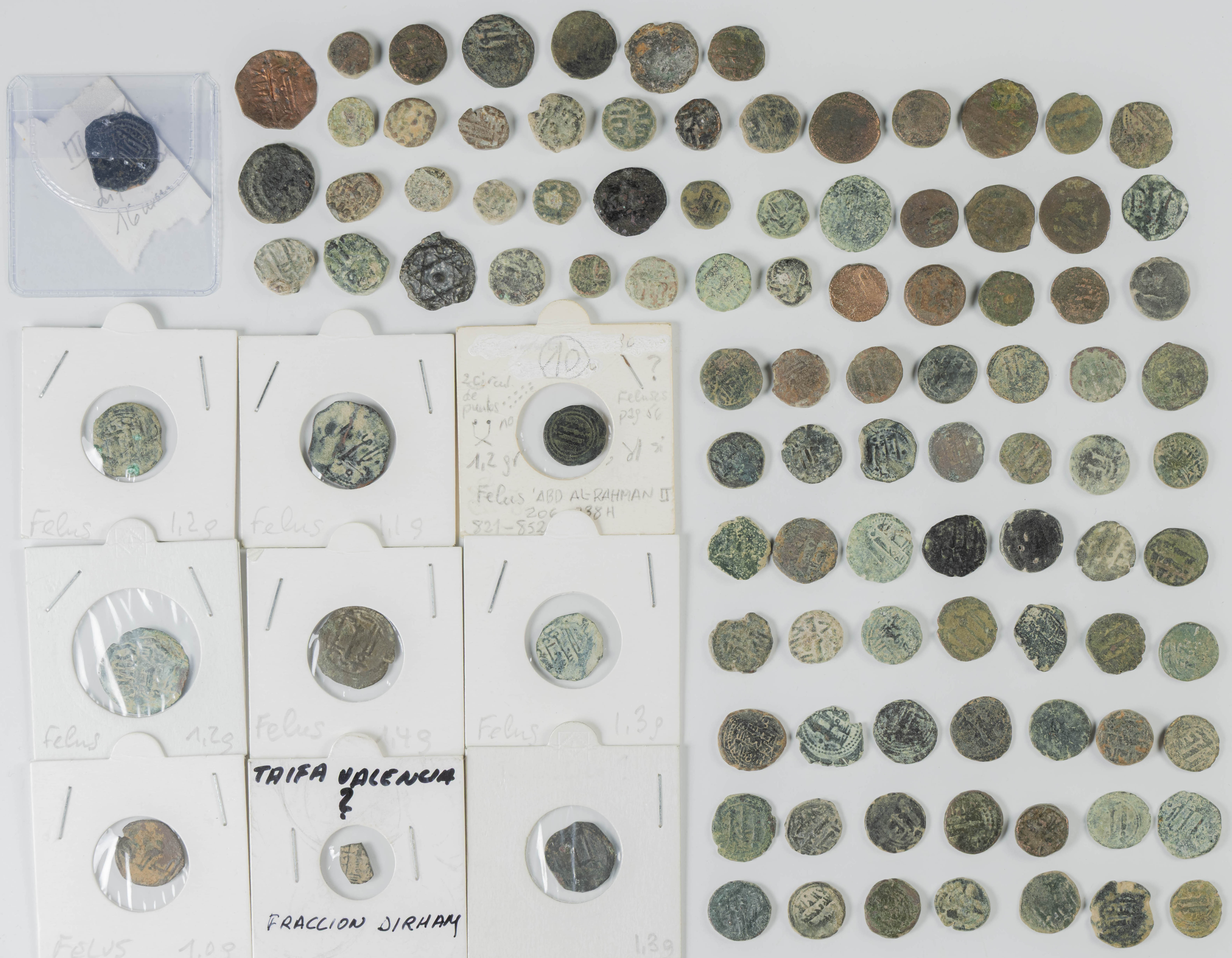 Interesante y amplio conjunto formado por centenares de féluses correspondientes a los peridos de gobernadores y emirato independiente, así como algunos ejemplares orientales. A destacar gran variedad de tipos y módulos, en parte agrupados por variantes. A EXAMINAR.