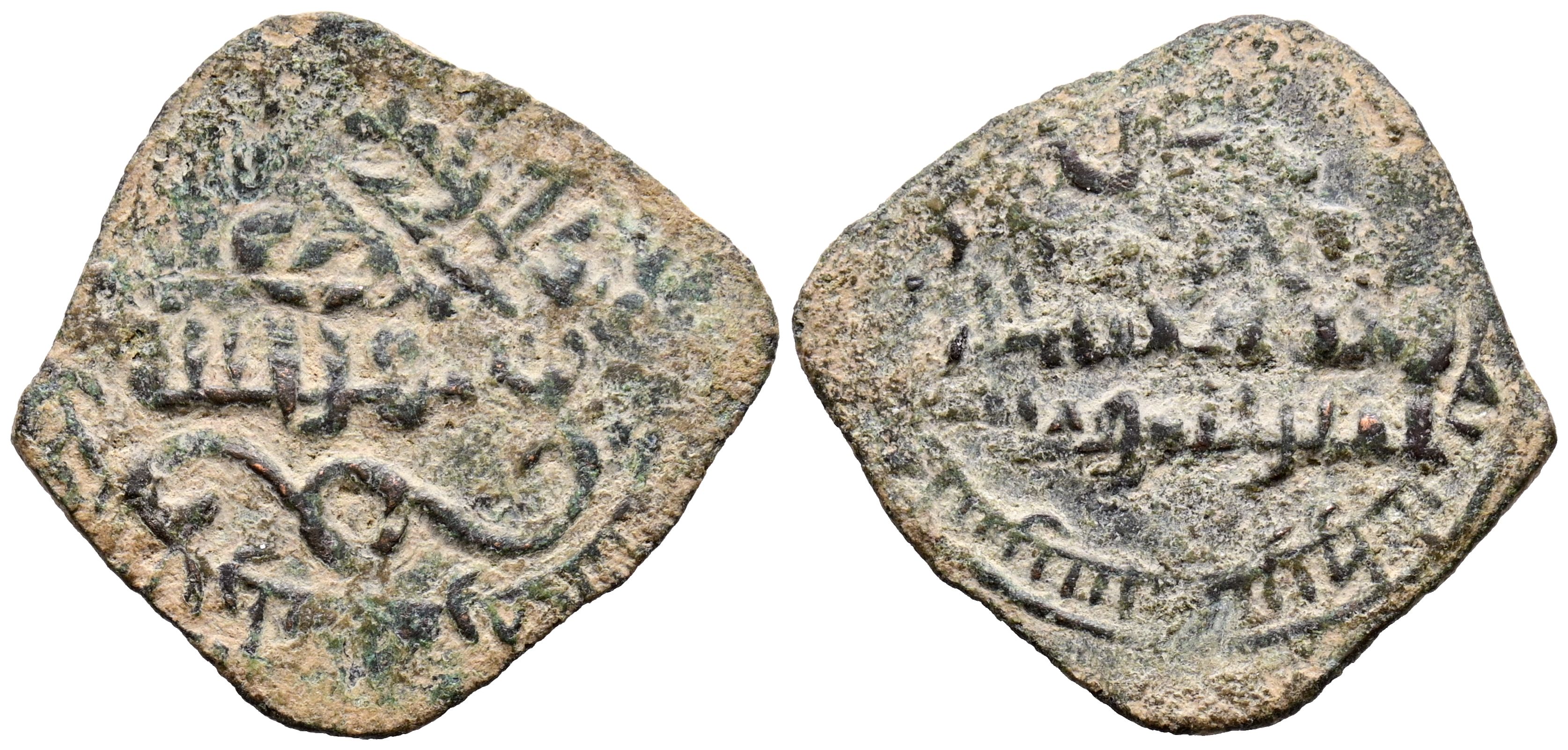 EMIRATO INDEPENDIENTE DE CÓRDOBA. Abd al-Rahman III. Felús. (Ae. 1,69g/23 mm). 3¿20?H. (Vives 374var; Frochoso I-92var). Anv: Citando a Yaḥyà / يحيى, 'Sahada' en dos líneas y el título Amir al muminin / امير المومنين en la parte infeiror, alrededor parte de la ceca y fecha completa perfectamente visibles en la orla. Rev: Misión profética en dos líneas y adorno elíptico en la parte inferior, alrededor orla parcialmente visible. Reacuñación diagonal con el nombre ¿Abd al-Rahman /عبد الرحمن?. MBC-. Muy raro e interantísimo ejemplar para estudio.