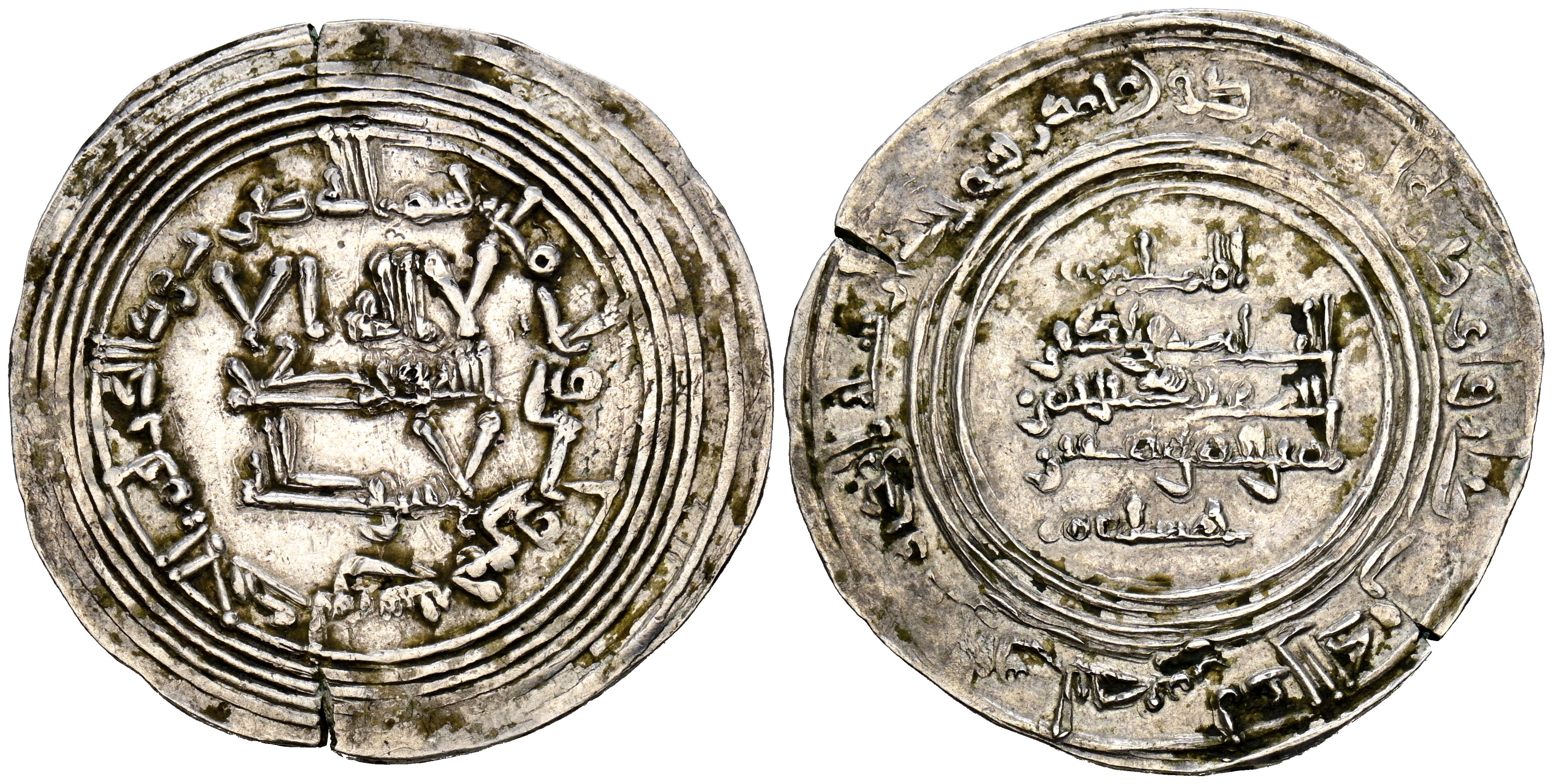 CALIFATO DE CÓRDOBA. 'Abd al-Rahman III. Dirham. (Ar. 4,72g/31mm). 335H. al-Ándalus / الاندلس. (Vives 409; Frochoso 335.10). Gran módulo. Citando a Hišām / حشام en IA. MBC+. Módulo grande. Repintes tanto en anverso como en reverso. Extraordinario ejemplar.