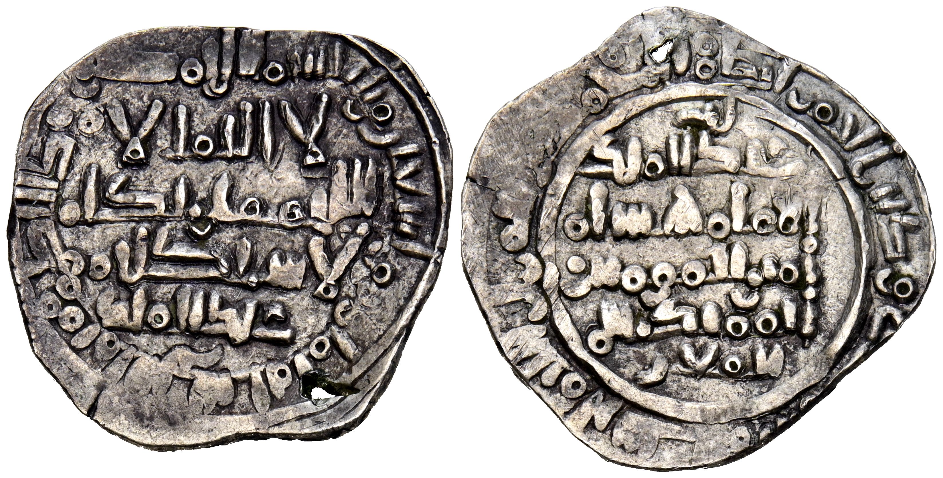 CALIFATO DE CÓRDOBA, Hisham II. Dirham. (Ar. 3,06g/24mm). 398H. Fez / فاس. (Vives 653 ). Citando a Abd al-Malik / عبد الملك en la IA. y al-Hayib Al-Mu'iz / المعز / الحاجب en IIA. MBC. Diminuta perforación. Raro ejemplar.