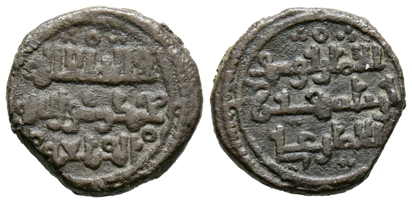 ALMORÁVIDES, Yusuf ben Tashfin y el emir Ali (497-500H). Quirate. (Ar. 0,94g/11mm). al -Qal'ah / القلعة. Anv: 'Shahada' en dos líneas, debajo ceca: القلعة. Rev: لامير علي / ابن تاشفين / لامير يسف (El emir Yusuf/ibn Tashfin/el emir Ali). MBC. Pátina oscura. Inédita con esta ceca.