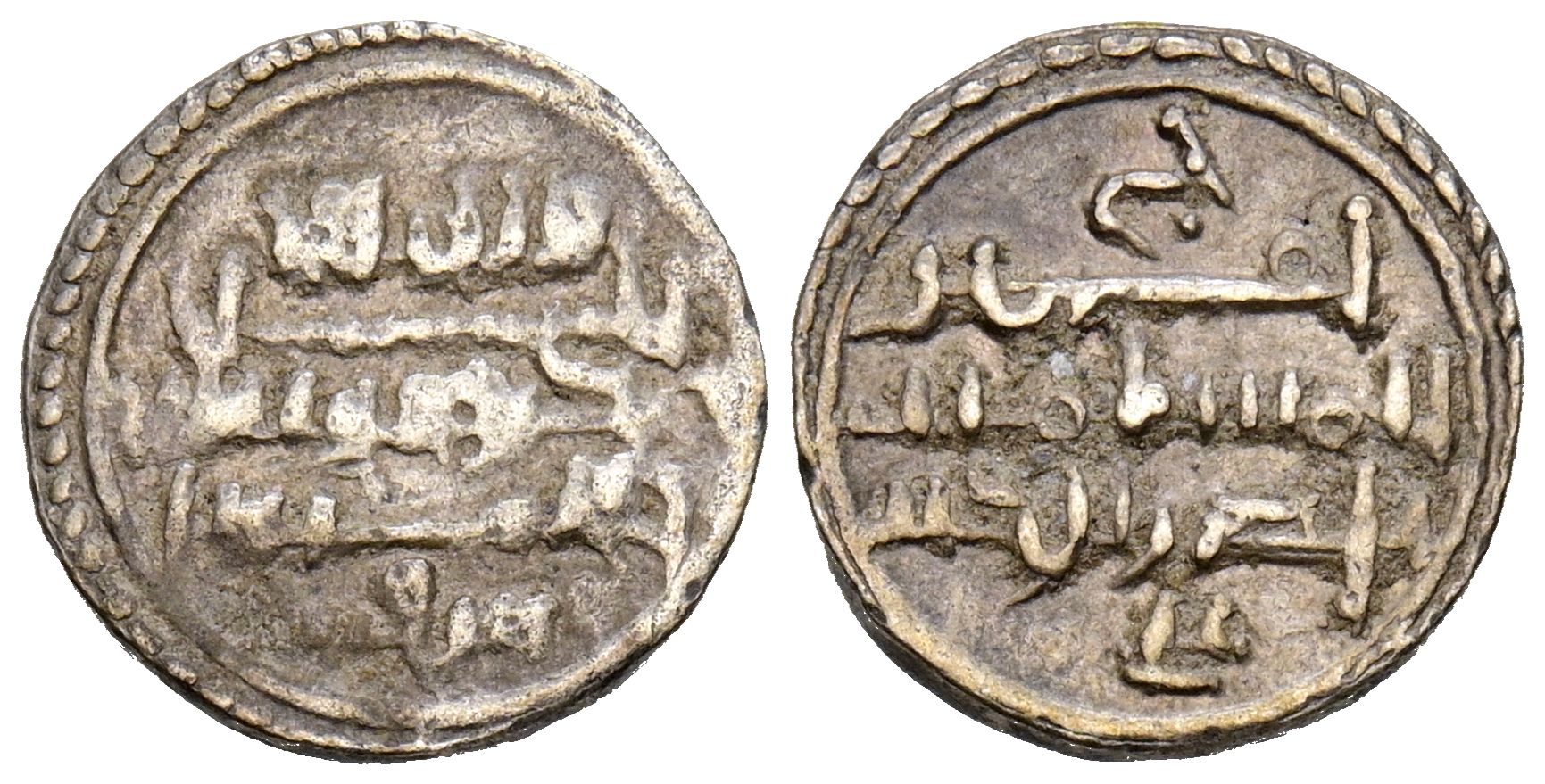 ALMORÁVIDES, Ali ibn Yusuf y el emir Tashfin (533-537H). Quirate. (Ar. 0,99g/12mm). (Vives 1827; Hazard 1004; Benito Cj7). Anv: 'Shahada' en tres líneas, debajo mención al heredero en dos: تاشفين/الامير. Rev: Presenta a Ali con títulos de Amir al-Muslimin y Nasir al-Din. MBC+.