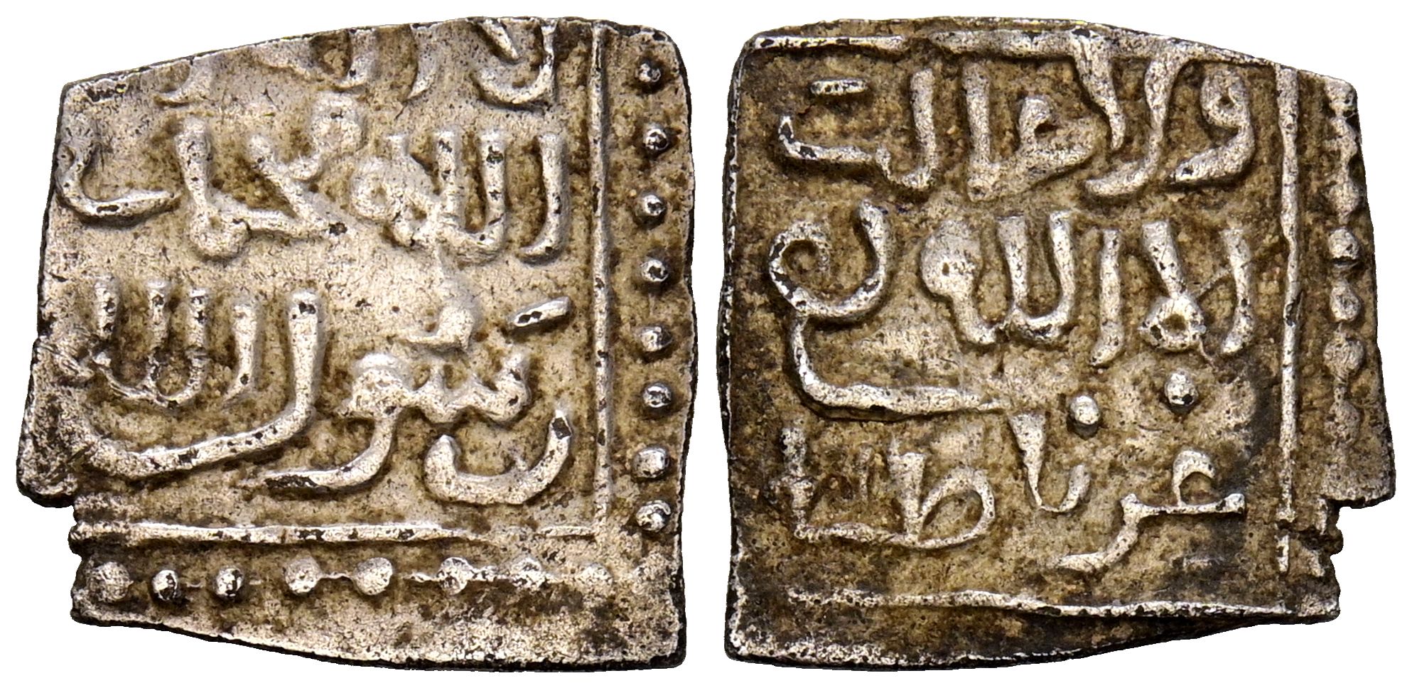 NAZARIES DE GRANADA, Anónimo. 1/2 Dirham. (Ar. 0,84g/14mm). Granada / غرناطة. (Vives 2191; Medina 266.a, Hohertz 747). Con “ta”, abreviatura de la palabra ta’ālà / تعالى que significa “ensalzado sea”. MBC.