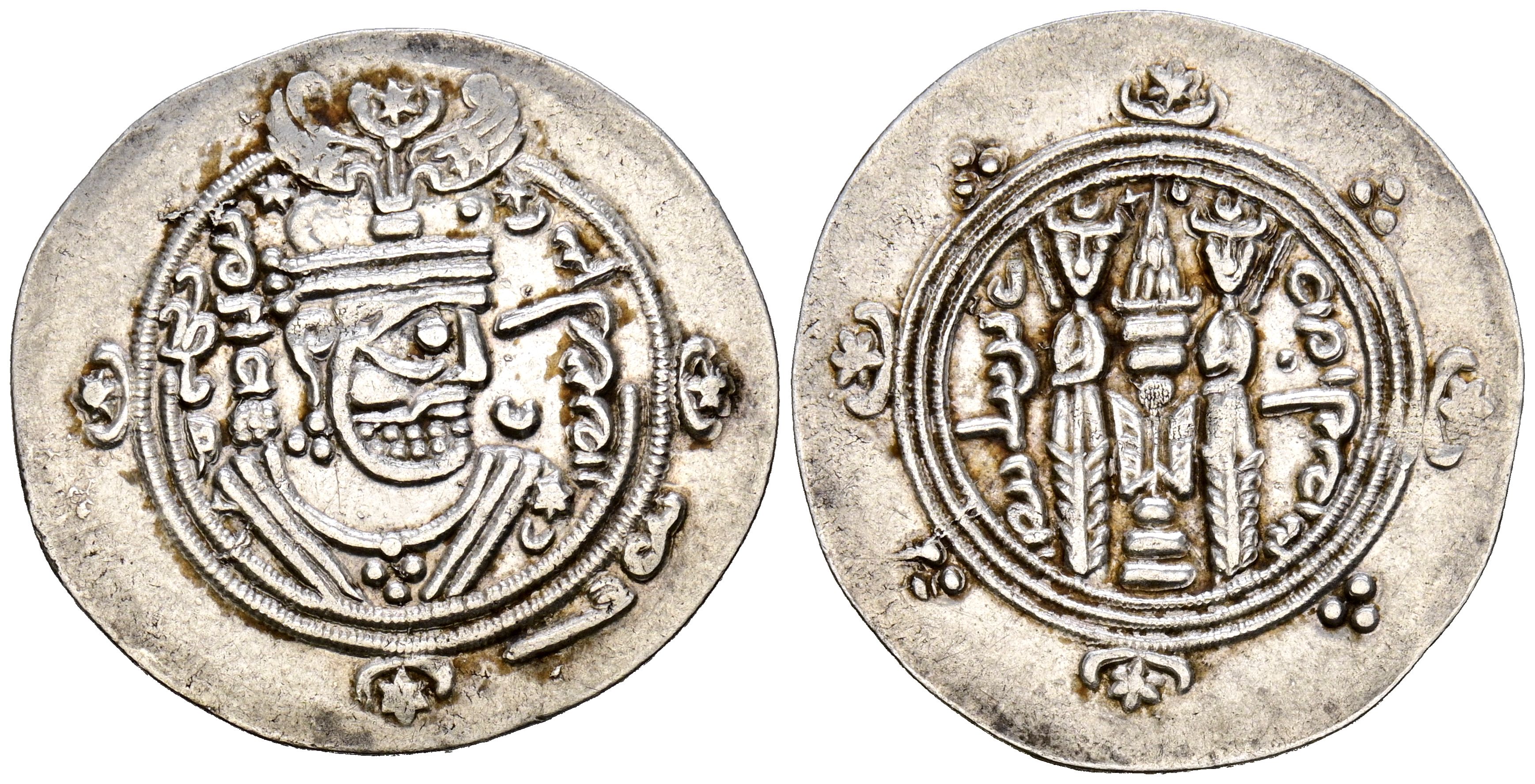 CALIFATO ABASIDA, Khurshid. Dirham Tabari. (Ar. 2,00g/25mm). 94 PYE/129H/745 d.C. Tabaristán. (Álbum52). Anv: Busto con corona alada mirando a derecha de tipo sasánida, leyenda en palavhi: a la derecha, Khurshid y a la izquierda, GDH (Explendor). En el exterior, a las 2h, 6h y 10h, creciente y estrella. Abajo a la derecha la palabra palavhi: ADB (Excelente). Rev: Altar de fuego flanqueado por dos sacerdotes, a la derecha: Tapurstan (Tabaristán), y a izquierda año de acuñación: 94 PYE (Post Yazgard Era) dentro de 3 orlas, en el exterior, a las 12h, 3h, 6h y 9h creciente y estrella, y en medio de estos adornos 3 puntos en forma de triángulo. MBC+.