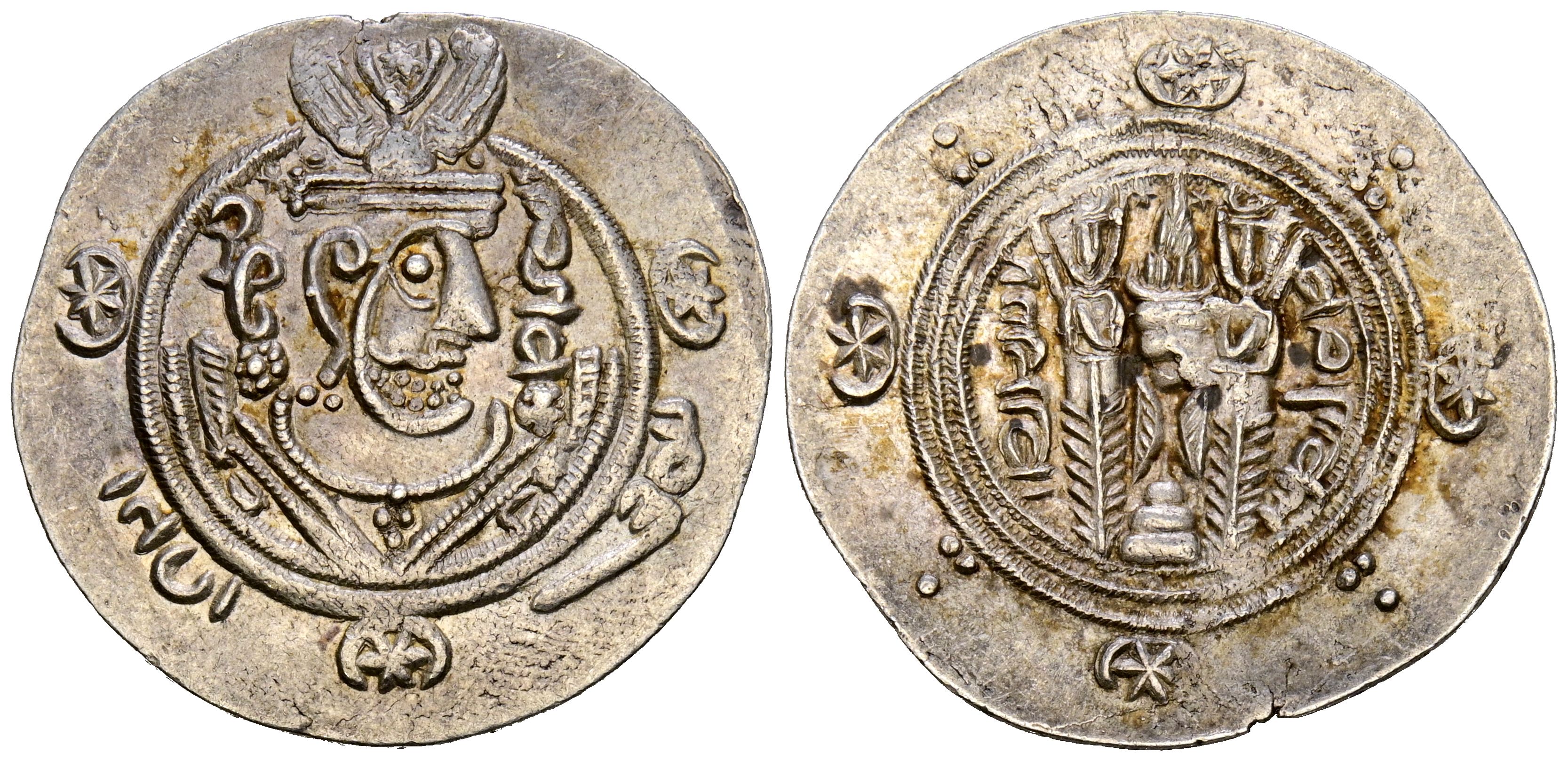 CALIFATO ABASIDA, Anónimo. Dirham Tabarí. (Ar. 2,16g/23mm). 122 PYE/157H/773-4 d.C. Tabaristán. (Álbum73). Anv: Busto con corona alada mirando a derecha de tipo sasánida, leyenda en palavhi: a la derecha, ABZUD (Crecimiento) y a la izquierda, GDH (Explendor). En el exterior, a las 2h, 6h y 10h, creciente y estrella. Abajo a la derecha la palabra palavhi: ADB (Excelente) y a izquierda NEK (Bueno). Rev: Altar de fuego flanqueado por dos sacerdotes, a la derecha: Tapurstan (Tabaristán), y a izquierda año de acuñación: 122 PYE (Post Yazgard Era) dentro de 3 orlas, en el exterior, a las 12h, 3h, 6h y 9h creciente y estrella, y en medio de estos adornos 3 puntos en forma de triángulo. MBC.