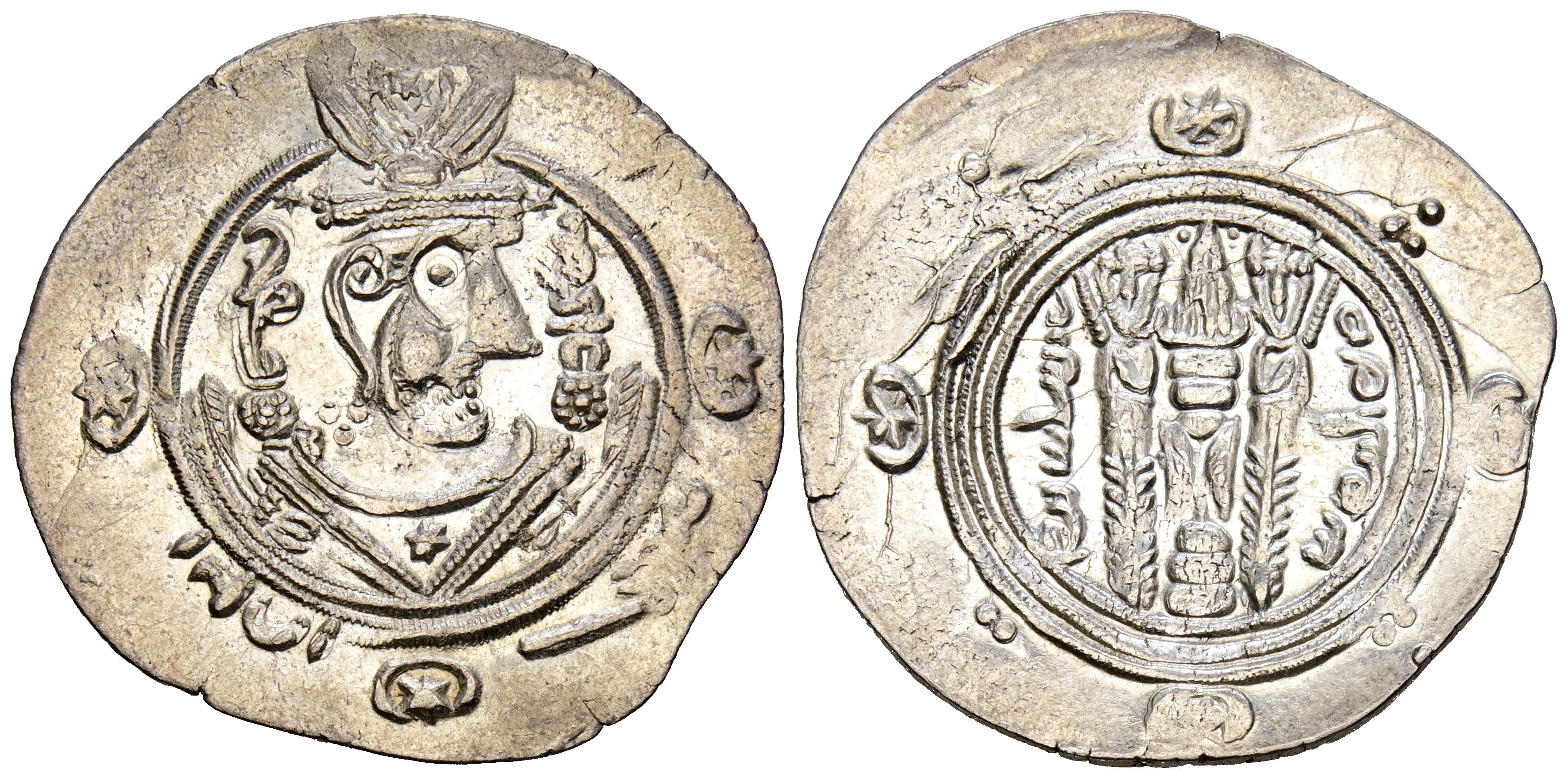 CALIFATO ABASIDA, Anónimo. Dirham Tabari. (Ar. 1,95g/24mm). 134 PYE/169H/785-6 d.C. Tabaristán. (Album73). Anv: Busto con corona alada mirando a derecha de tipo sasánida, leyenda en palavhi: a la derecha, ABZUD (Crecimiento) y a la izquierda, GDH (Explendor). En el exterior, a las 2h, 6h y 10h, creciente y estrella. Abajo a la derecha la palabra palavhi: ADB (Excelente) y a izquierda BAKH BAKH (Muy bueno) en árabe. Rev: Altar de fuego flanqueado por dos sacerdotes, a la derecha: Tapurstan (Tabaristán), y a izquierda año de acuñación: 134 PYE (Post Yazgard Era) dentro de 3 orlas, en el exterior, a las 12h, 3h, 6h y 9h creciente y estrella, y en medio de estos adornos 3 puntos en forma de triángulo. EBC-.