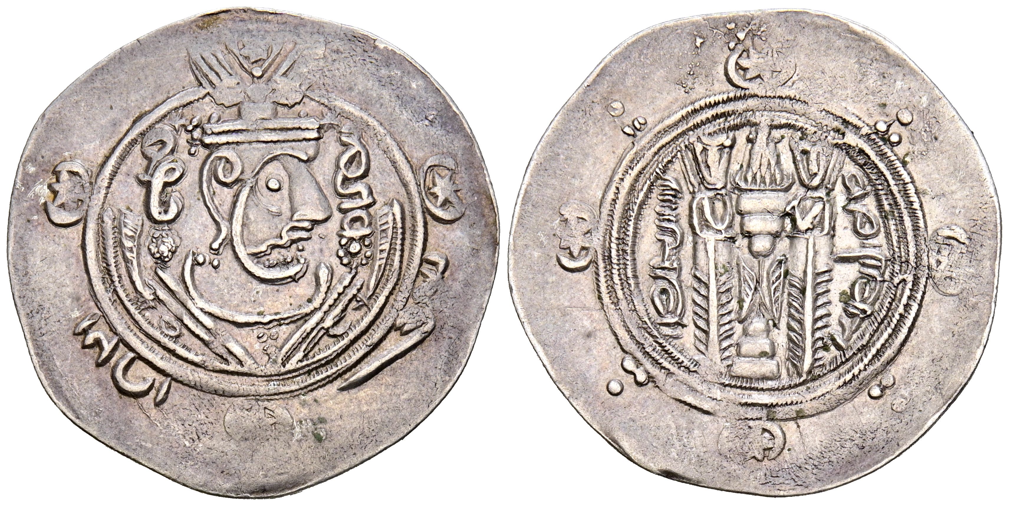 CALIFATO ABASIDA, Anónimo. Dirham Tabari. (Ar. 2,00g/24mm). 136 PYE/171H/787-8 d.C. Tabaristán. (Álbum73). Anv: Busto con corona alada mirando a derecha de tipo sasánida, leyenda en palavhi: a la derecha, ABZUD (Crecimiento) y a la izquierda, GDH (Explendor). En el exterior, a las 2h, 6h y 10h, creciente y estrella. Abajo a la derecha la palabra palavhi: ADB (Excelente) y a izquierda NEK (Bueno). Rev: Altar de fuego flanqueado por dos sacerdotes, a la derecha: Tapurstan (Tabaristán), y a izquierda año de acuñación: 136 PYE (Post Yazgard Era) dentro de 3 orlas, en el exterior, a las 12h, 3h, 6h y 9h creciente y estrella, y en medio de estos adornos 3 puntos en forma de triángulo. MBC.