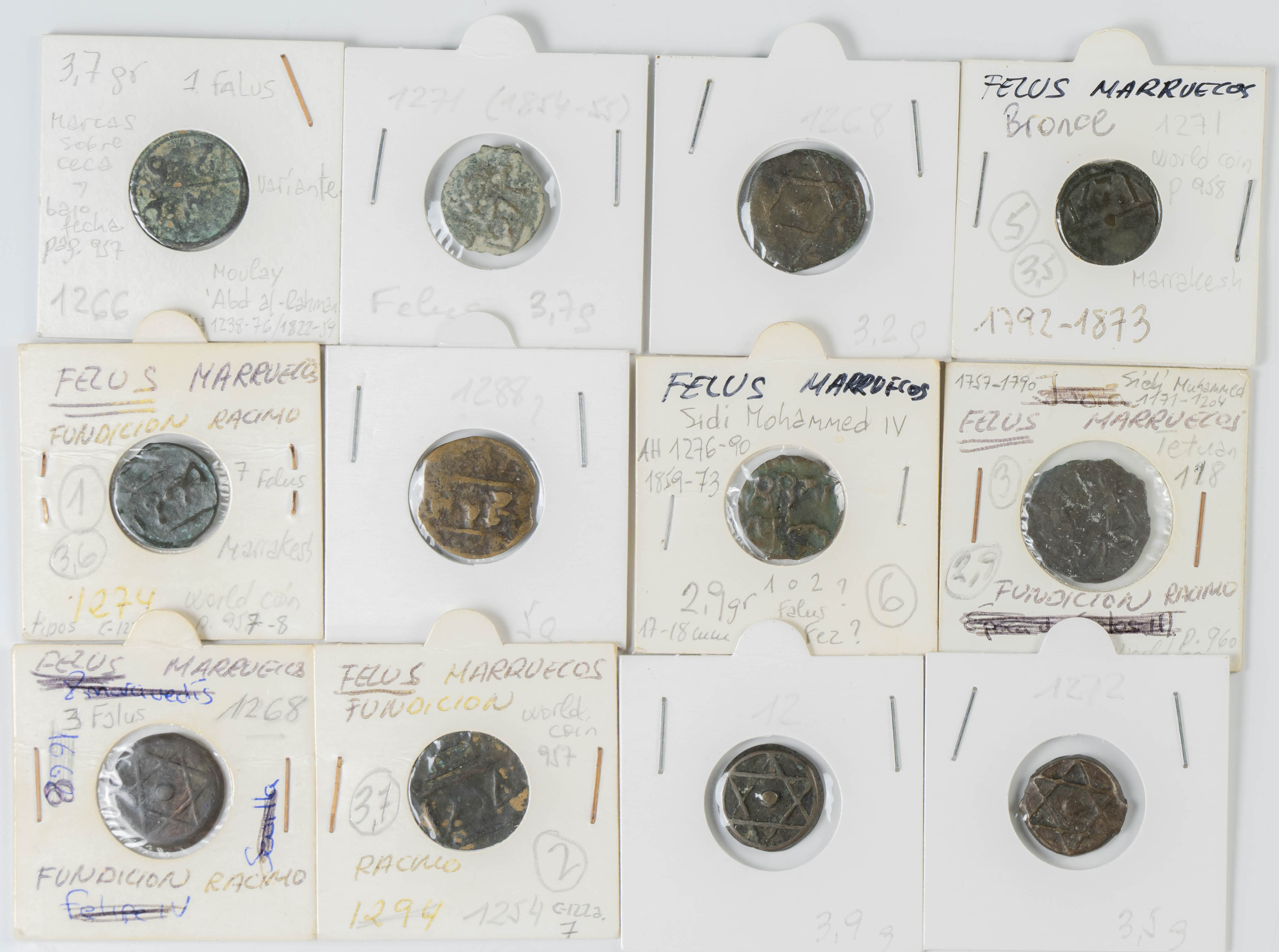 Interesante conjunto formado por 12 féluses marroquíes acuñados entre 1254H y 1288H. Diferentes años, medidas y estados de conservación. A EXAMINAR.