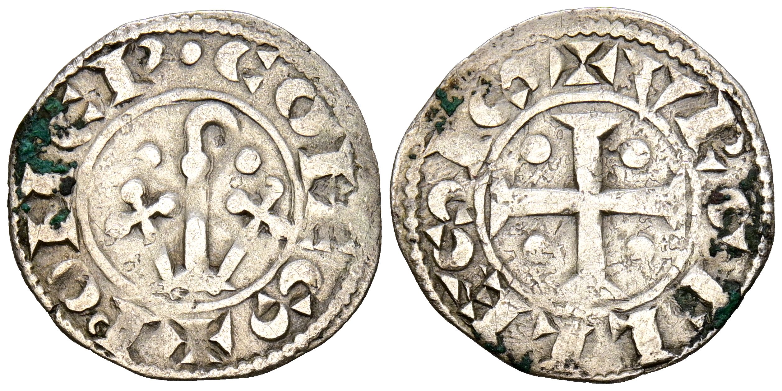 PONS DE CABRERA (1236-1243). Diner (Ve. 0,78g/17mm). Agramunt (Condado de Urgell). (Cru.V.S. 126.1). Anv: Báculo entre puntos y tréboles, alrededor leyenda: PONCI' COMES. Rev: Cruz interior patada con puntos en los espacios, alrededor leyenda: VRGELLESIS. MBC.