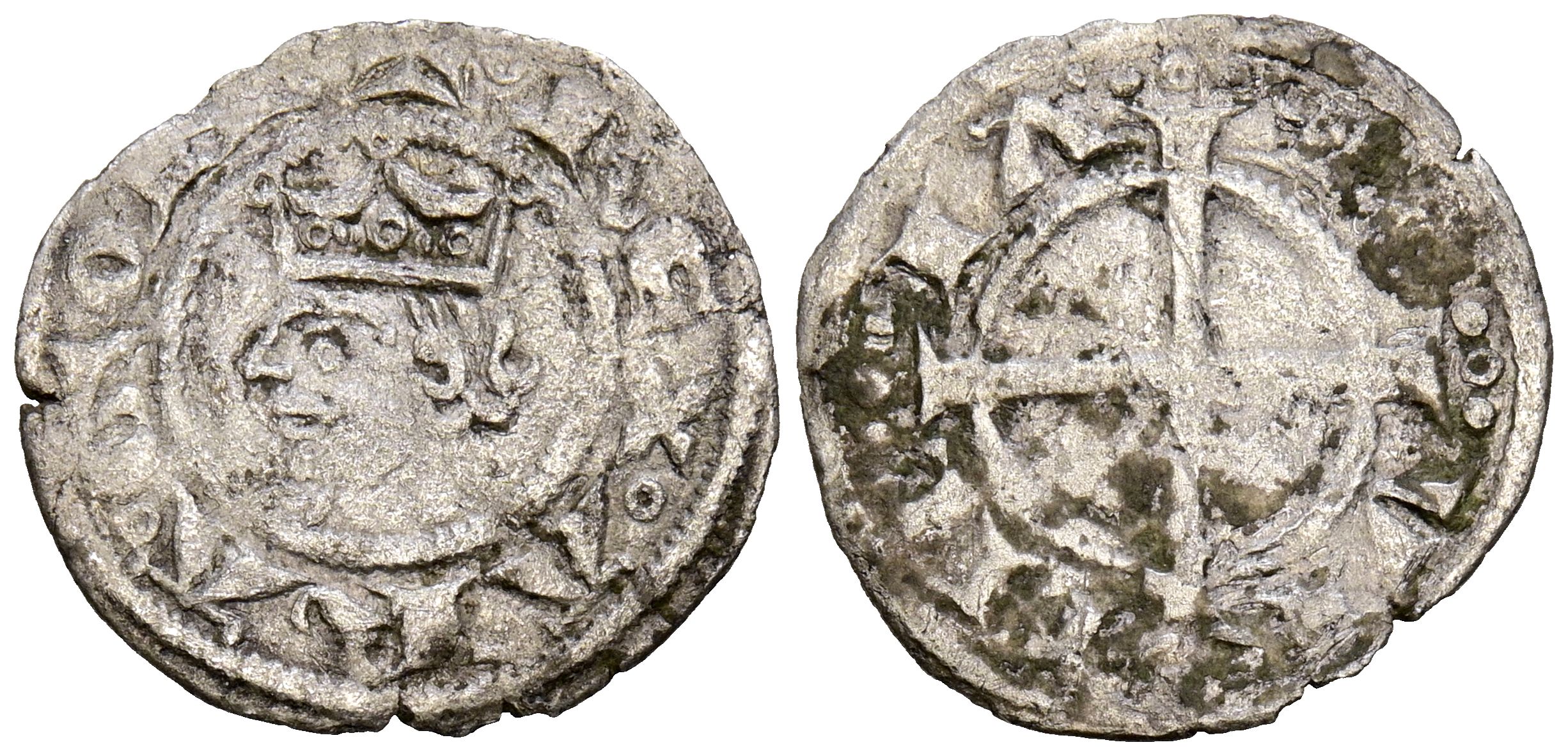 JAIME I (1213-1276). Dinero. (Ve. 0,62g/17mm). Marsella, Condado de la Provenza. (Cru.V.S. 174; Cru C.G-2124). Busto coronado de Jaime I a izquierda dentro de una gráfila circular, alrededor leyenda: REX ARA GONE. Rev: Cruz pasante con tres puntos en los extremos, alrededor leyenda: PO VI NC IA. MBC/MBC-. Rara.