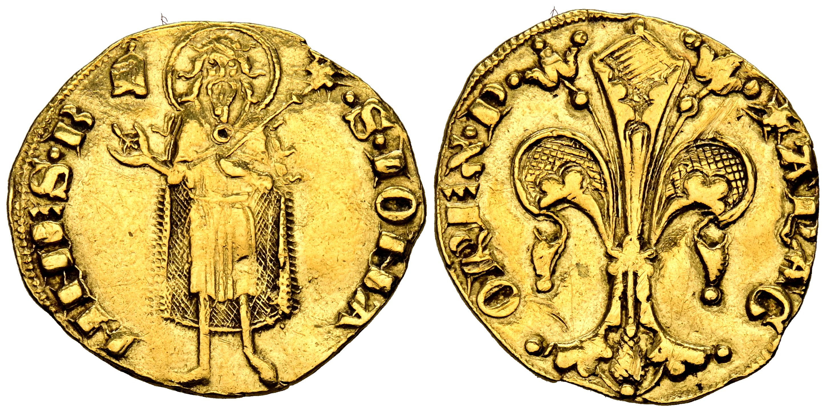 PEDRO IV (1336-1387). Florín. (Au. 3,41g/21mm). Perpiñán. (Cru V.S. 386). Anv: San Juan estante de frente portando cetro, en campo marca de ceca: yelmo, alrededor leyenda: IOHANNES B. Rev: Flor de lis, alrededor leyenda: ARAGO REX. MBC. Limpiado.