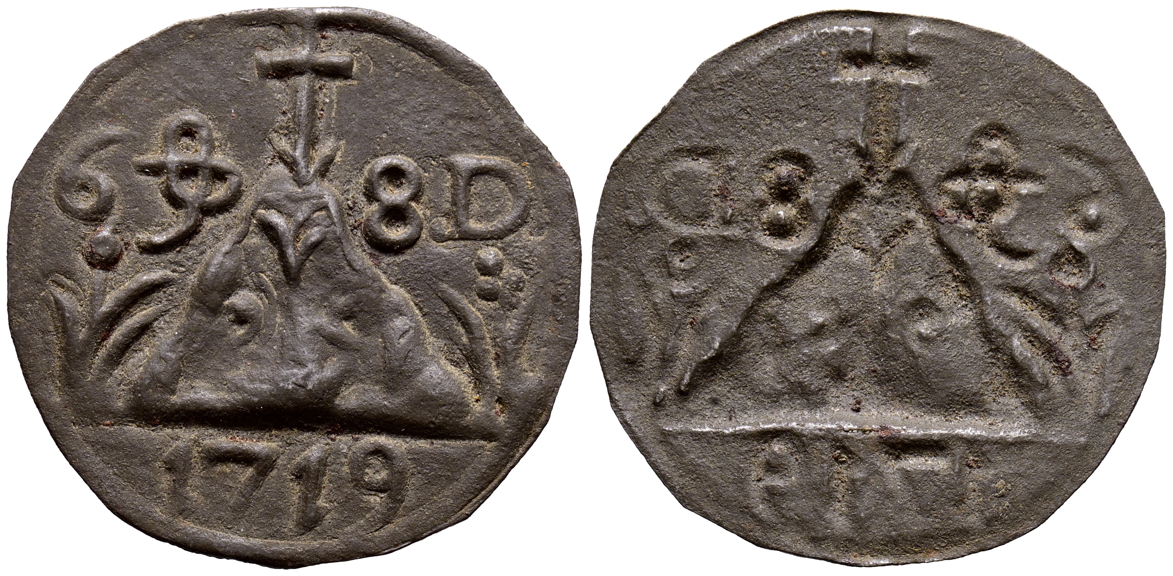 OLOT. Pellofa. (Hojalata. 1,03g/28mm). Valor 6 Sou-8D. 1719. (Cru.L. 1909). MBC+.