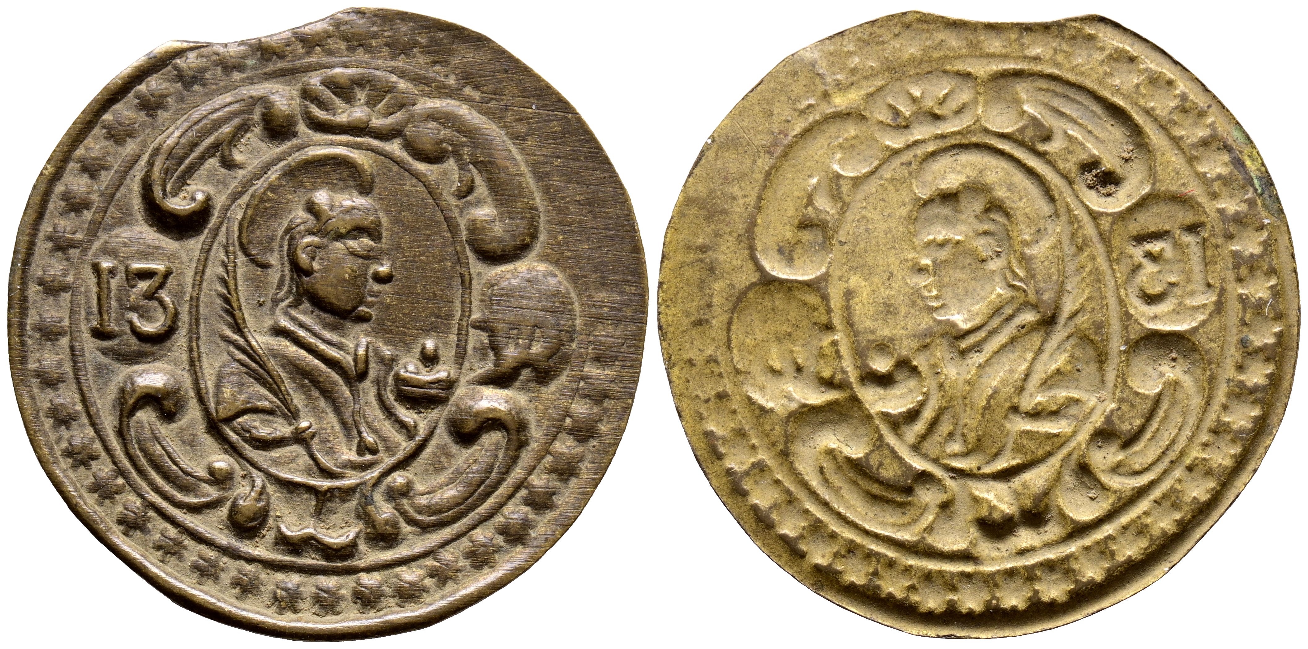OLOT. Pellofa. (La. 1,04g/30mm). Valor 13 Sou. (Cru.L. 1913). EBC. Escasa y más así.