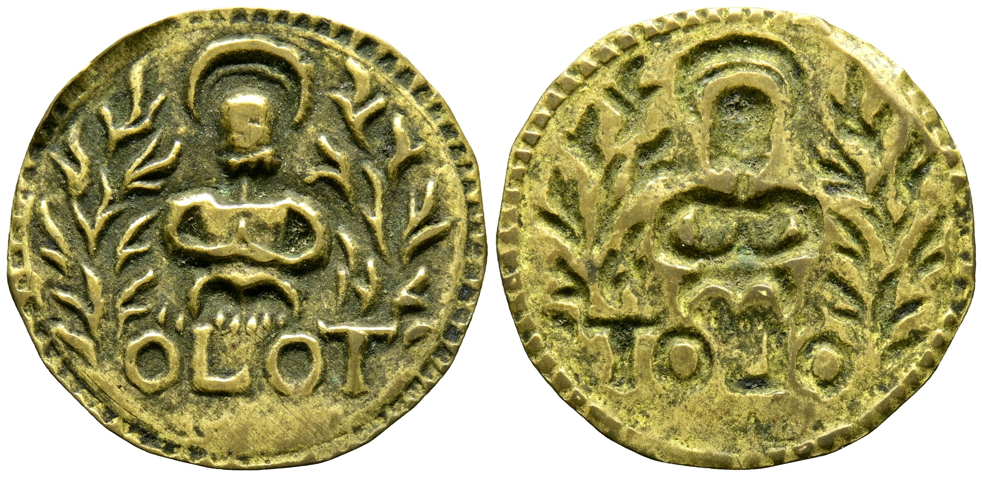 OLOT. Pellofa. (Latón. 0,43g/22mm). Figura orante. (Cru.L. 1921). MBC+. Escasa.