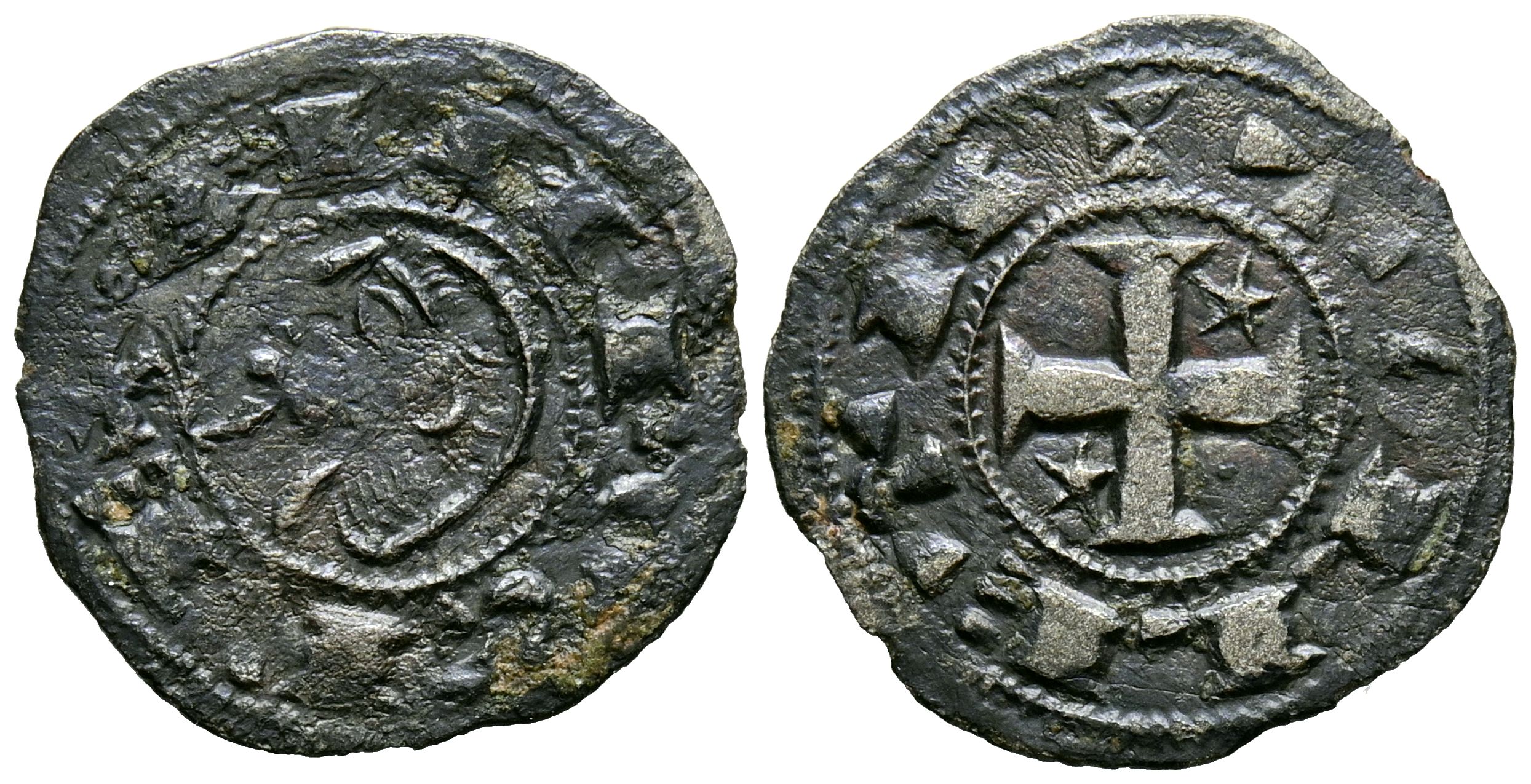 ALFONSO VIII (1158-1214). Dinero. (Ve. 0,82g/18mm). Taller itinerante de batalla. (Imperatrix A8:28.1; FAB-25.3 como Alfonso I de Aragón). Anv: Busto a izquierda dentro de gráfilar circular, alrededor leyenda: ANFVS REX. Rev: Cruz patada con estrella en primer y cuarto cuadrante, todo dentro de una gráfila circular, alrededor leyenda: TOLLETA. MBC+. Atractivo ejemplar.