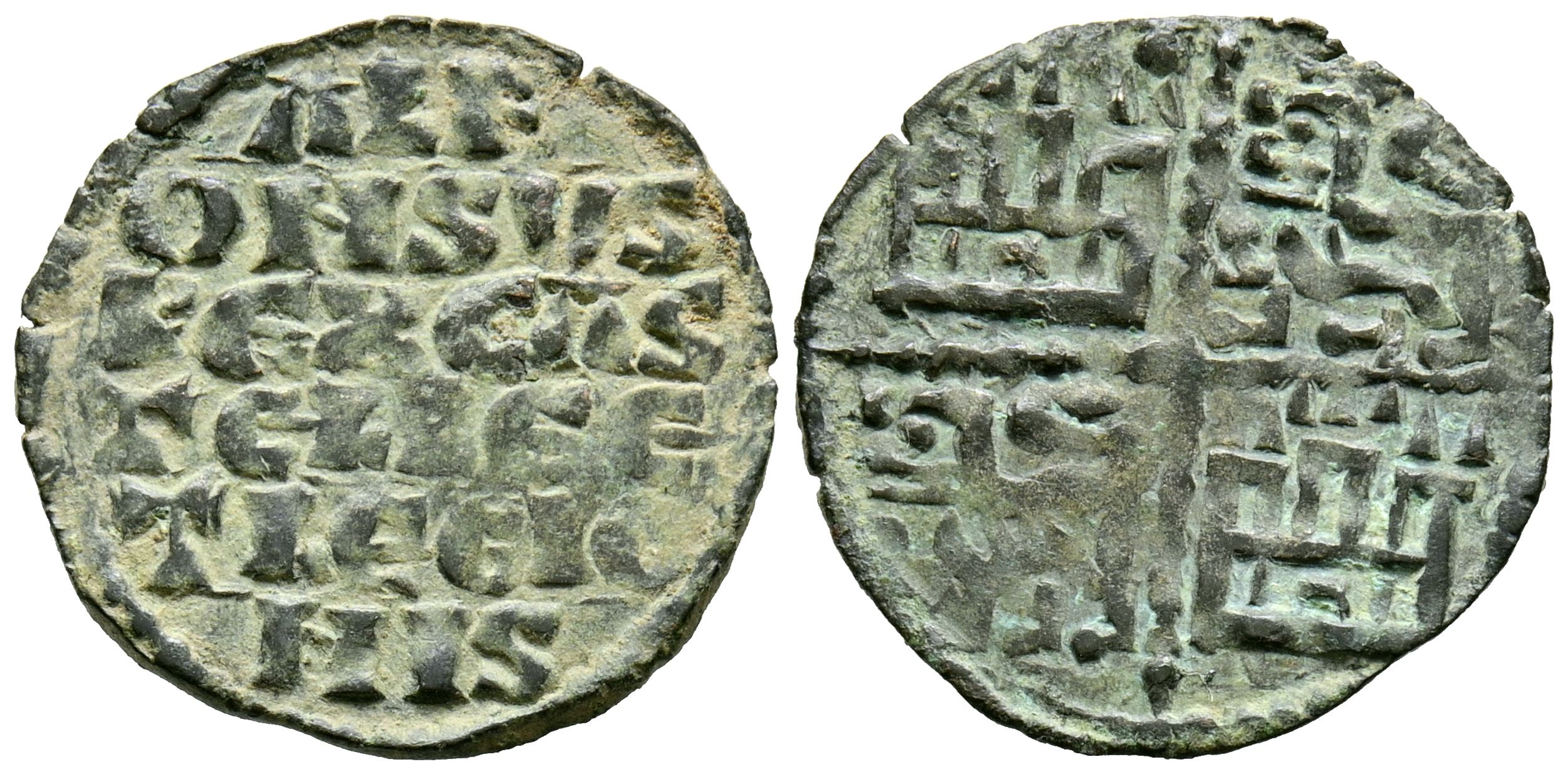 ALFONSO X (1252-1284). Dinero Alfonsí ''de la 1º guerra de Granada". (Ve. 0,85g/17mm). Marca de ceca: punto. (FAB-240). Anv: Leyenda en seis líneas: ALFONSVS REX CASTELLE ET LEGIONIS. Rev: Castillos y leones con marca de ceca en 1º cuadrante. MBC. Atractivo ejemplar.