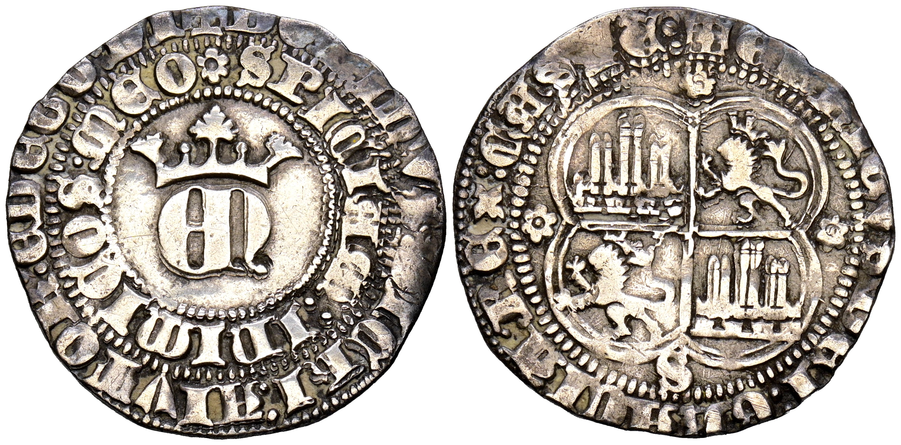 ENRIQUE II (1368-1379). Real. (Ar. 3,39g/26mm). Sevilla. (Imperatrix E2:22.33; FAB-406). Anv: Anagrama EN coronado dentro de gráfila perlada, alrededor leyenda circular en dos líneas: DOMINVS MICHI ADIVTOR ET EGO DIS/PICIAM INIMICOS MEOS. Rev: Cuartelado de castillos y leones rampantes a izquierda dentro de gráfila cuatrilobular, debajo S, alrededor leyenda: ENRICVS DEI GRACIA REX CASTEL. MBC.