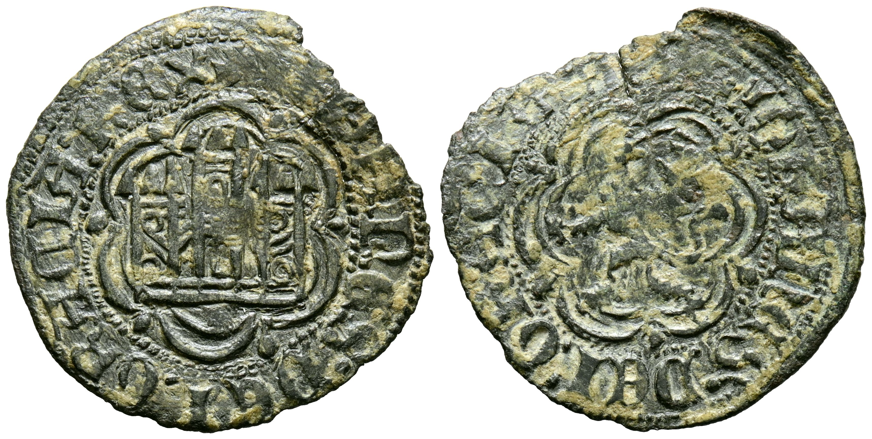 JUAN II (1406-1454). Blanca. (Ae. 2,05g/24mm). Coruña. (Imperatrix J2:1.42; FAB-626). Anv: Castillo, debajo venera, dentro de gráfila lobular, alrededor leyenda: IOHANES DEI GRACIA REX. Rev: León rampante a izquierda dentro de gráfila lobular, alrededor leyenda: IOHANES DEI GRACIA REX. MBC-. Cospel faltado.