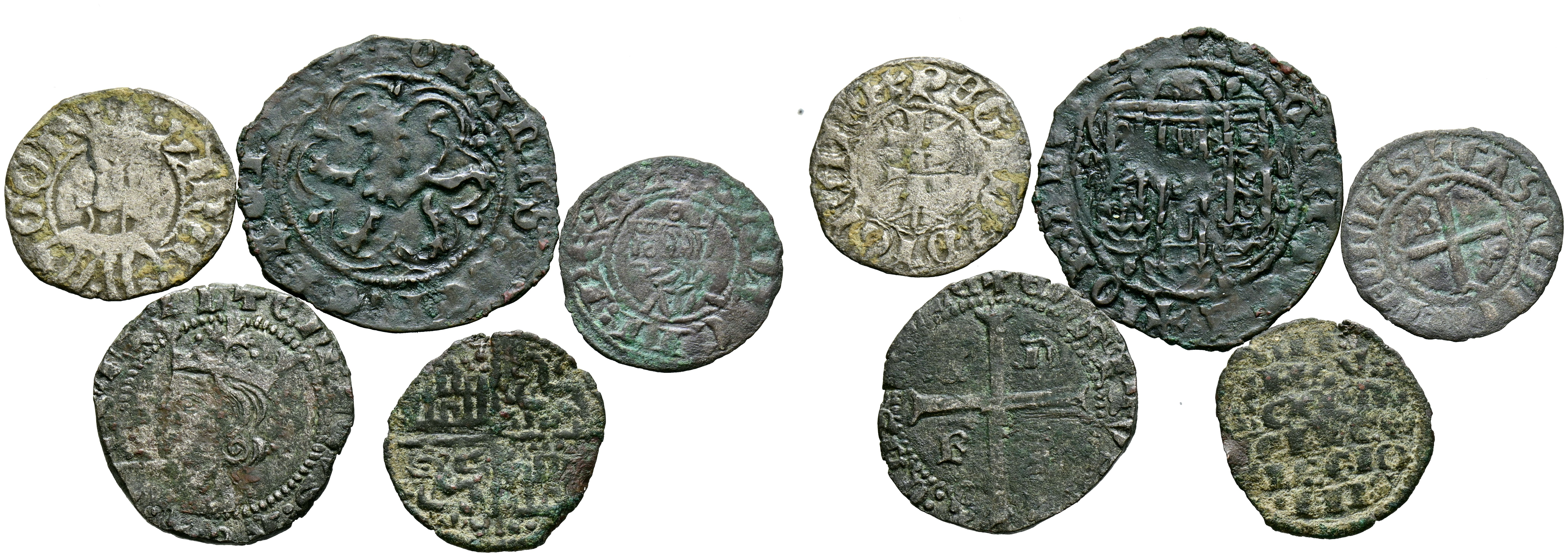 Interesante conjunto formado por 5 monedas corespondientes a los reindos de Alfonso X, Sancho IV, Enrique II, Pedro IV y Juan II. Diferentes modulos, medidas y estados de conservación. A EXAMINAR.