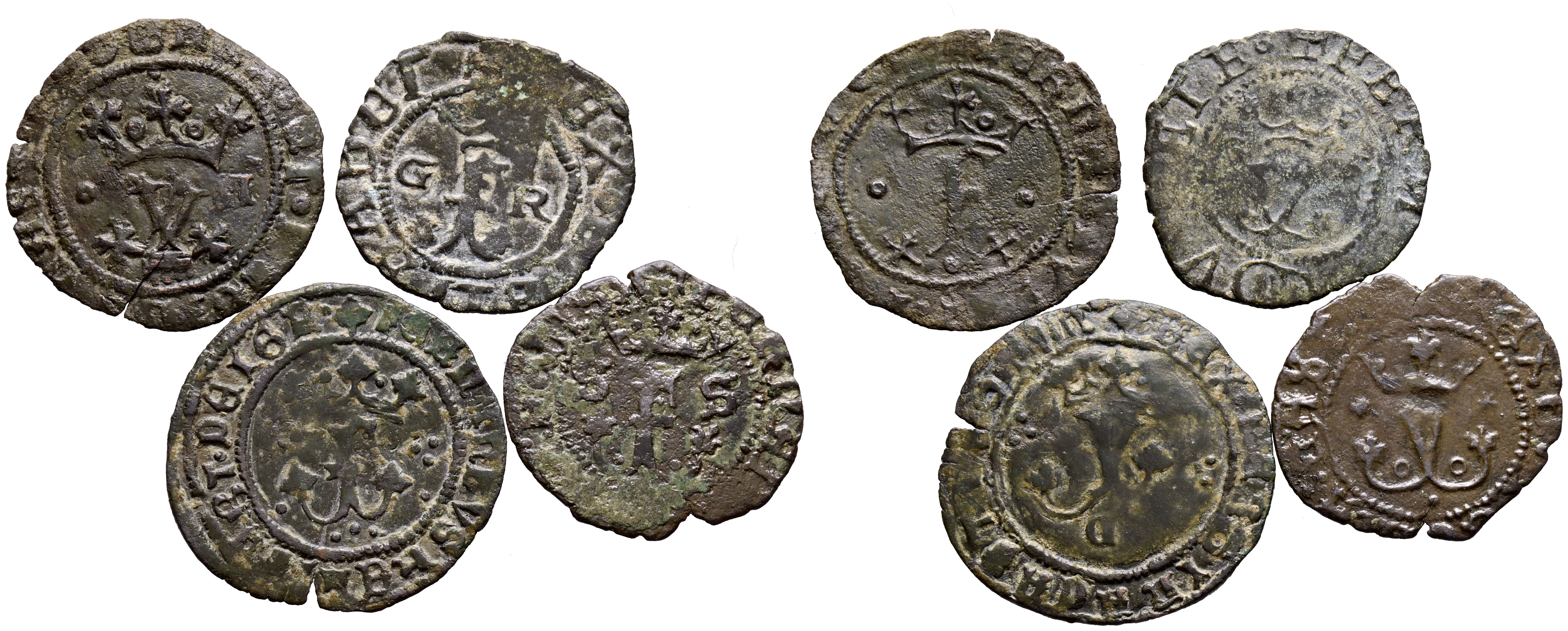 REYES CATÓLICOS (1474-1504). Conjunto de 4 blancas de las cecas de Sevilla (2), Granada y Segovia. Diferentes estados de conservación. A EXAMINAR.