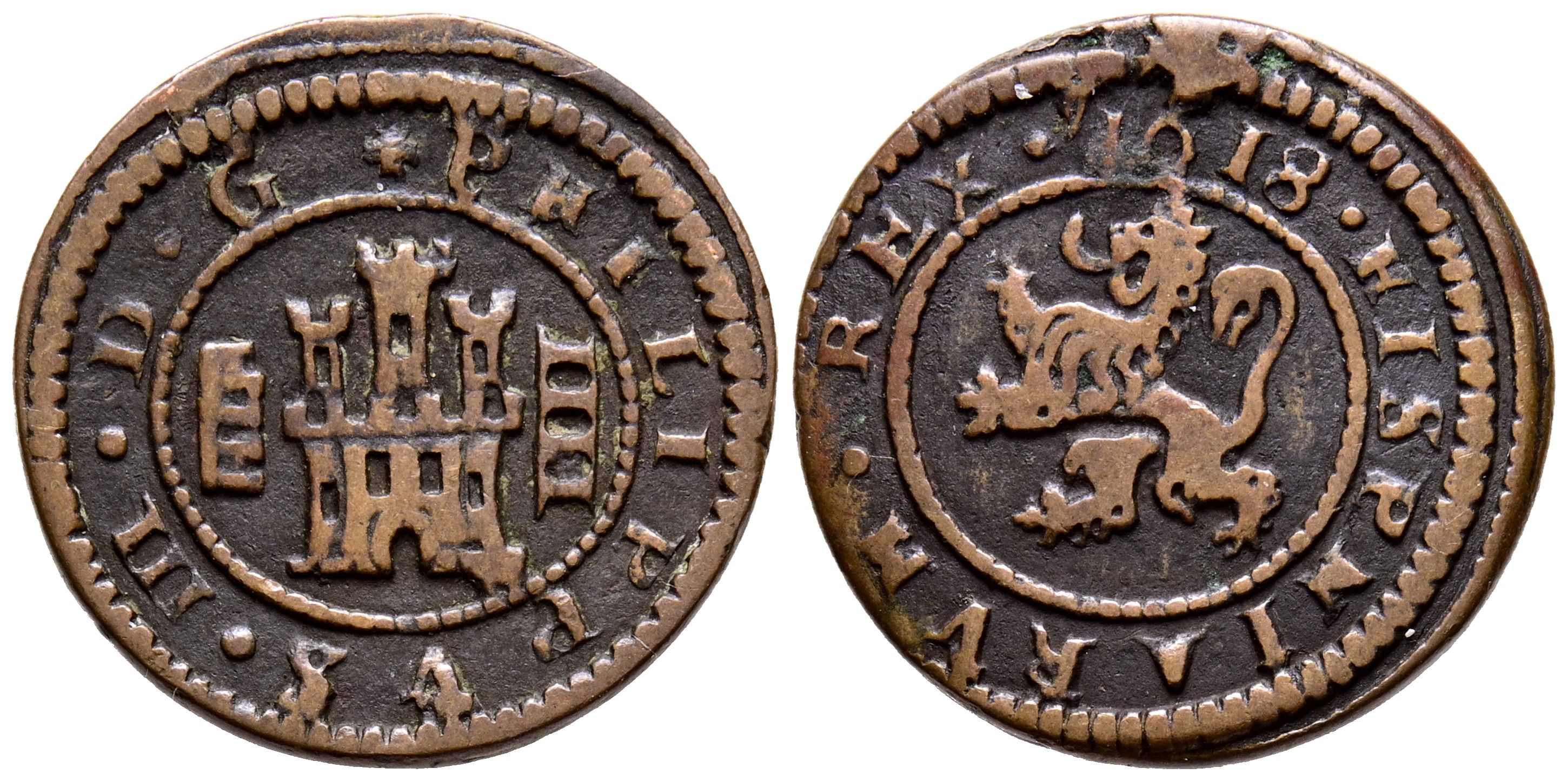 FELIPE III (1598-1621). 4 Maravedís. (Ae. 3,24g/20mm). 1618. Segovia. (Cal-2019-268var). Error en leyenda: HISPNIARVM. MBC. Escasa.
