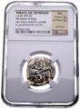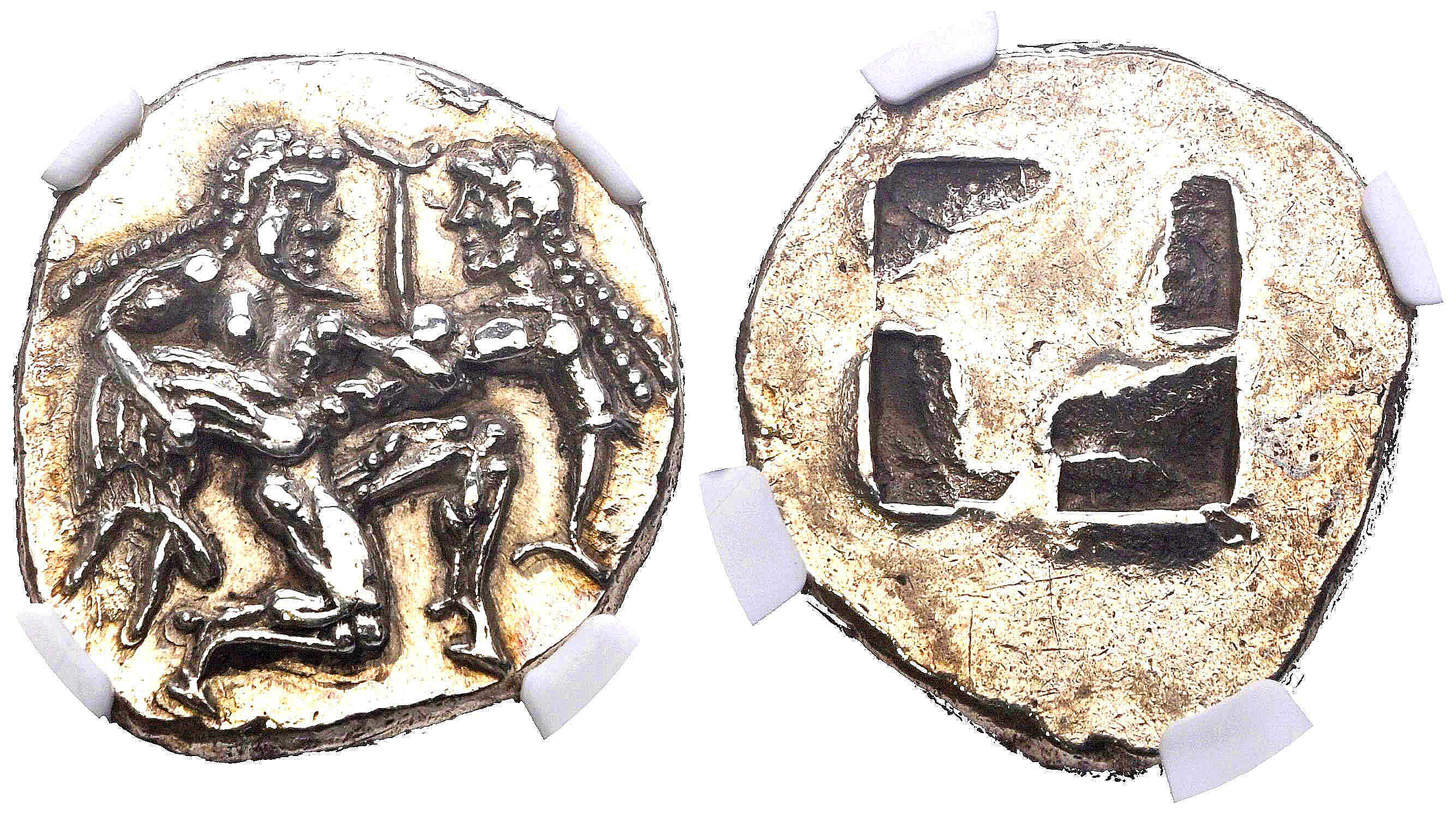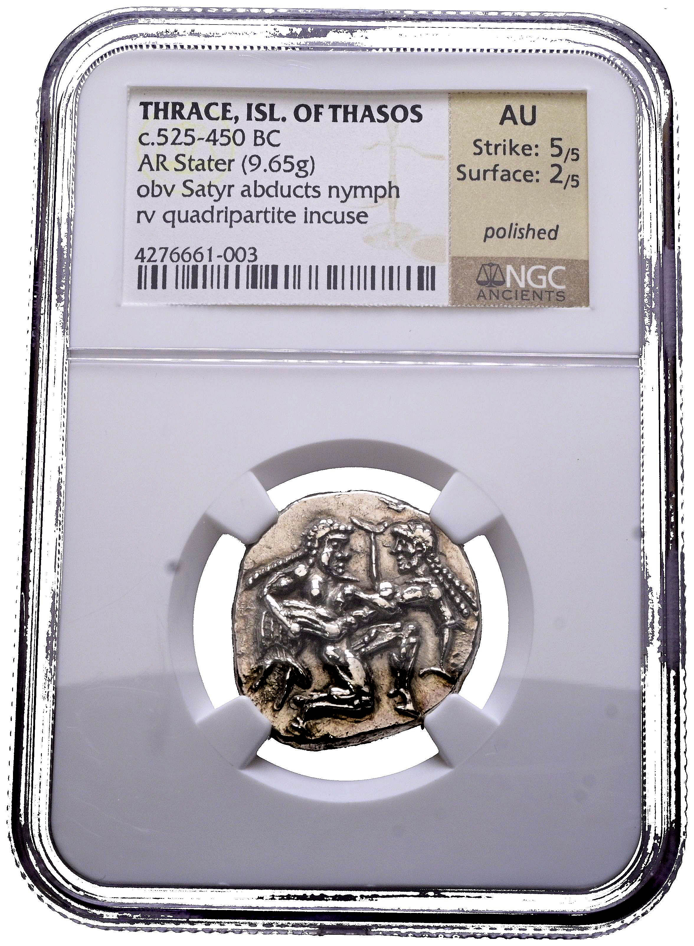 TRACIA, Thasos. Estátera. (Ar. 9,65g/23mm). 480-463 a.C. (SNG Copenhagen 1009; HGC 6, 331). Anv: Sátiro con barba avanzando a derecha de rodillas, cogiendo en brazo a ninfa con las manos alzadas. Rev: Cuatripartito incuso. Encapsulado por NGC AU, Strike: 5/5 - Surface: 2/5. Polished. Escaso ejemplar.