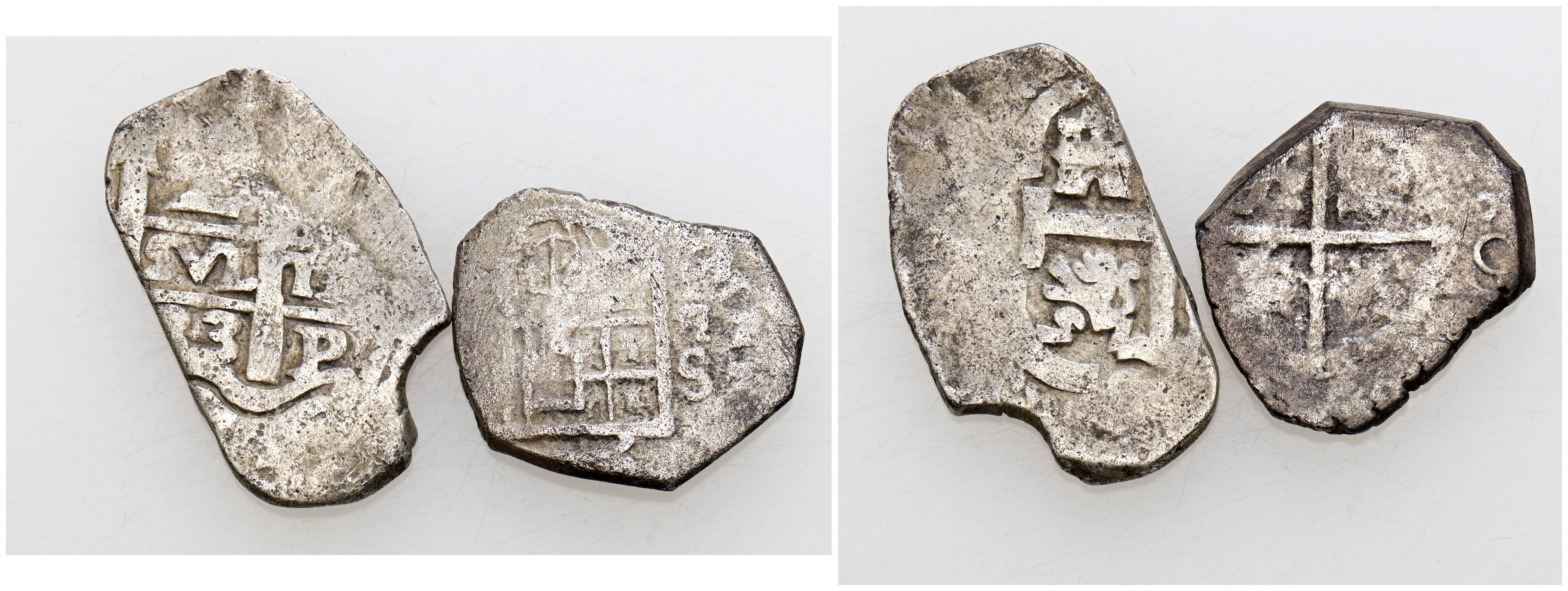 Interesante pareja de macuquinas acuñadas bajo los reinados de Felipe III y Felipe IV. Dierentes cecas, medidas y estados de censervación. A EXAMINAR.
