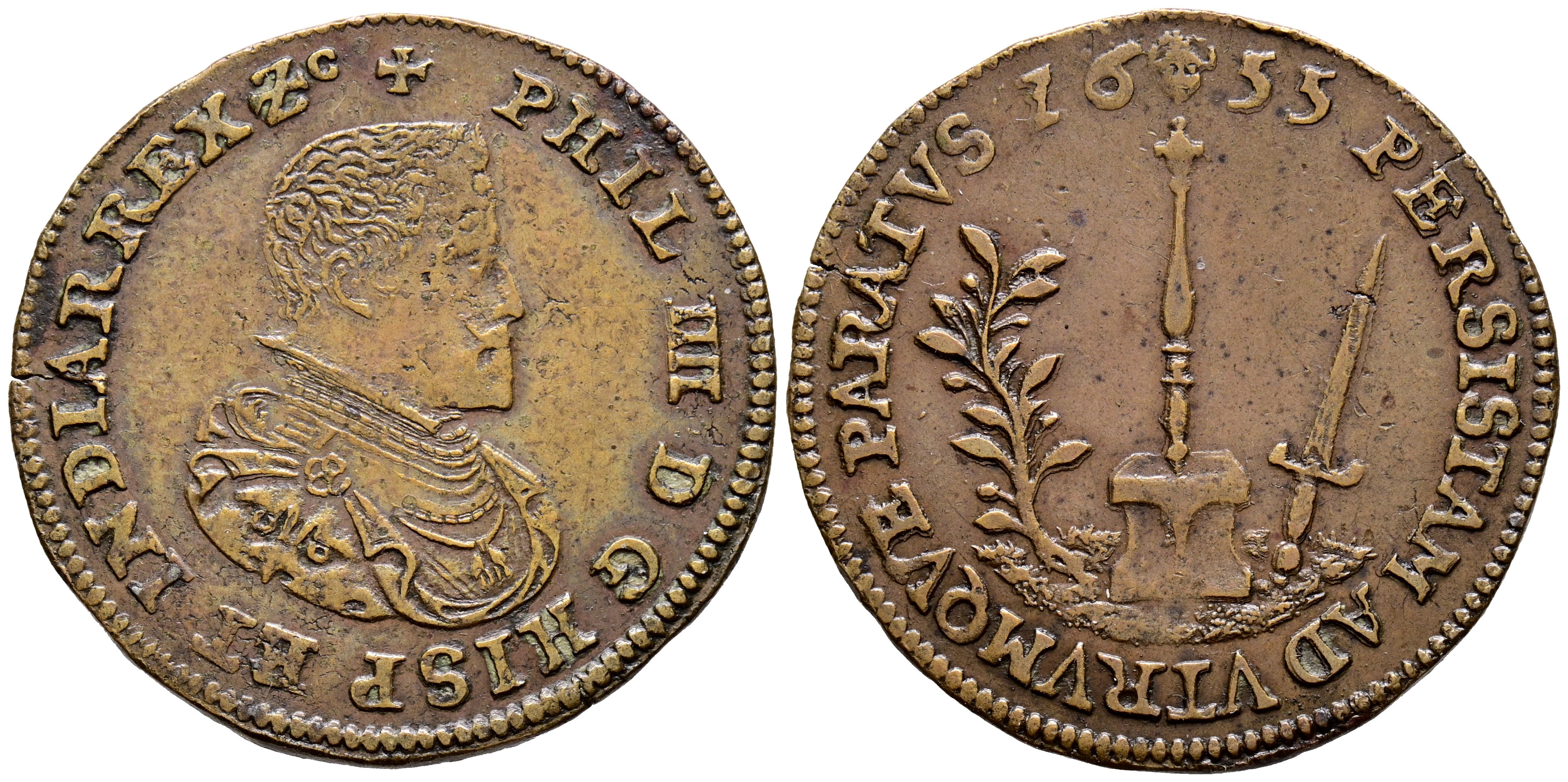 FELIPE IV (1621-1665). Jetón. (Ae. 5,60g/31mm). 1655. Bruselas. Tesorería desconocida. La defensa contra los franceses. (Dugniolle 4074). MBC.
