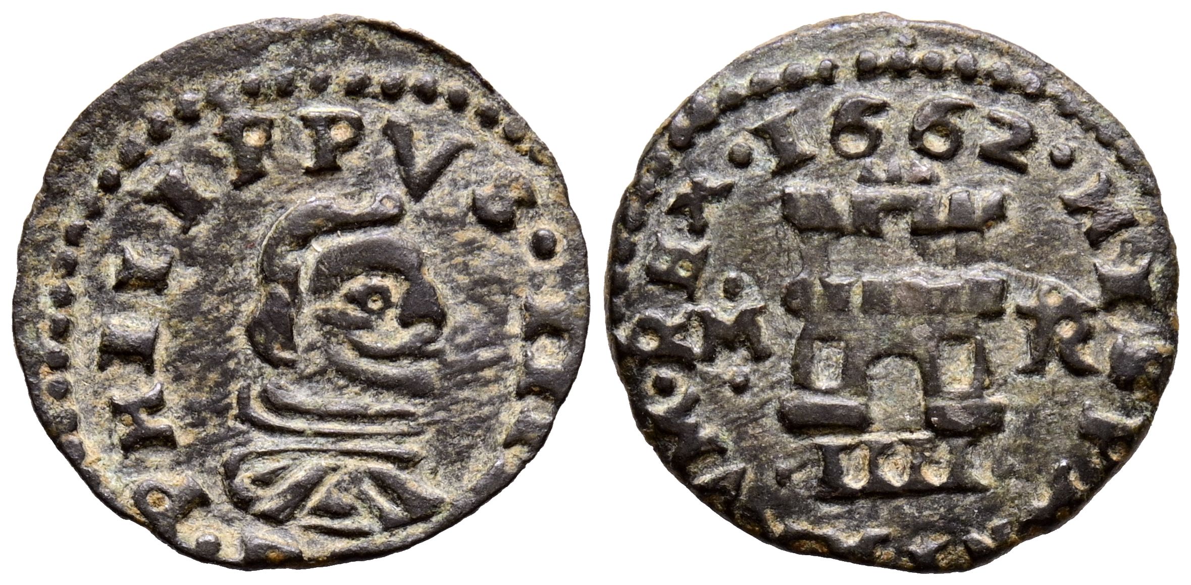 FELIPE IV (1621-1665). 4 Maravedís. (Ae. 0,90g/16mm). 1662. Trujillo M. (Cal-2019-282). Ceca a derecha, ensayador a izquierda. MBC.