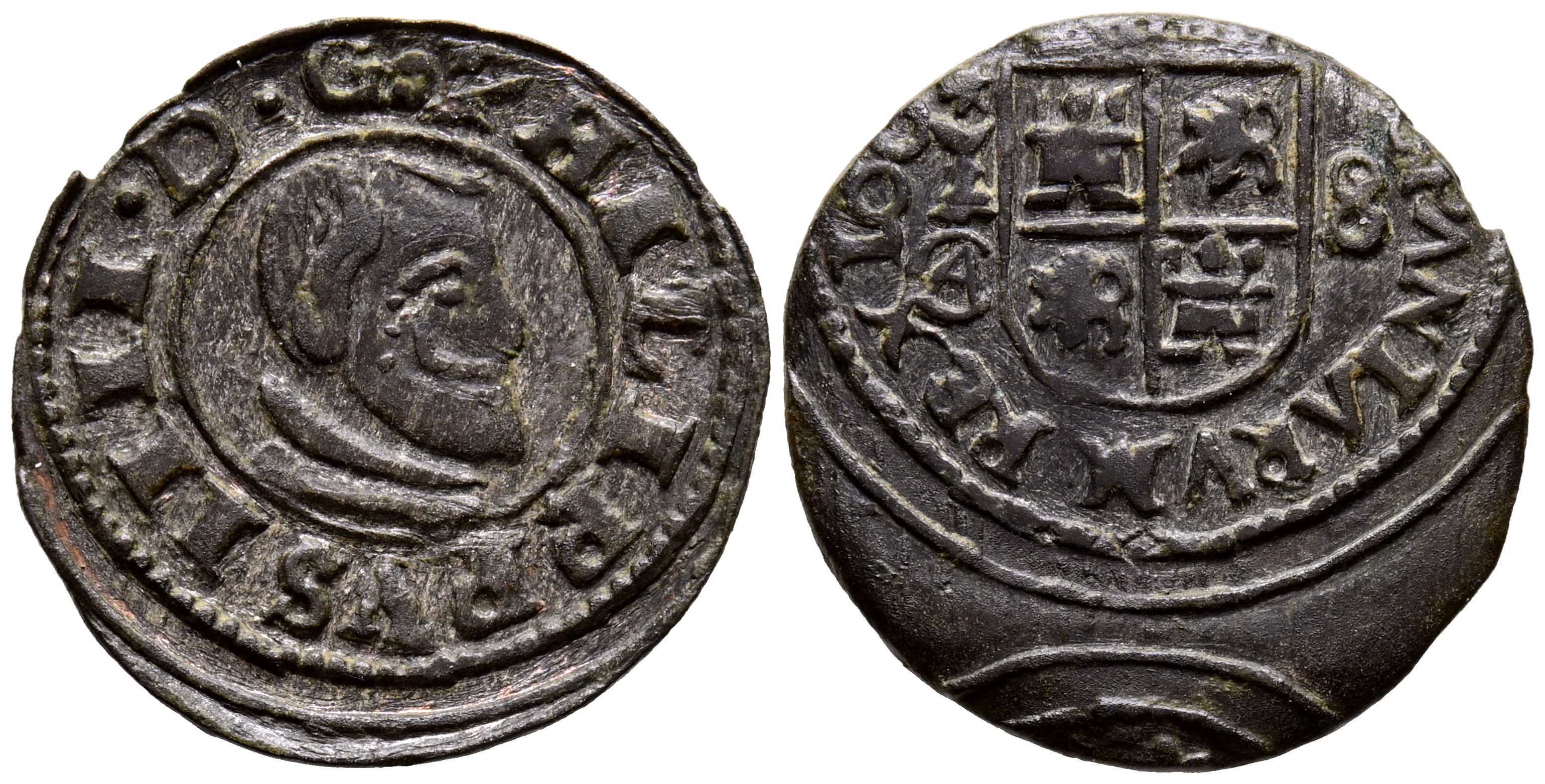 FELIPE IV (1621-1665). 8 Maravedís. (Ae. 2,25g/21mm). 166?. Cuenca. (Cal-2019-Tipo 104). MBC+. Levísimos restos de plateado original. Acuñación desplazada.