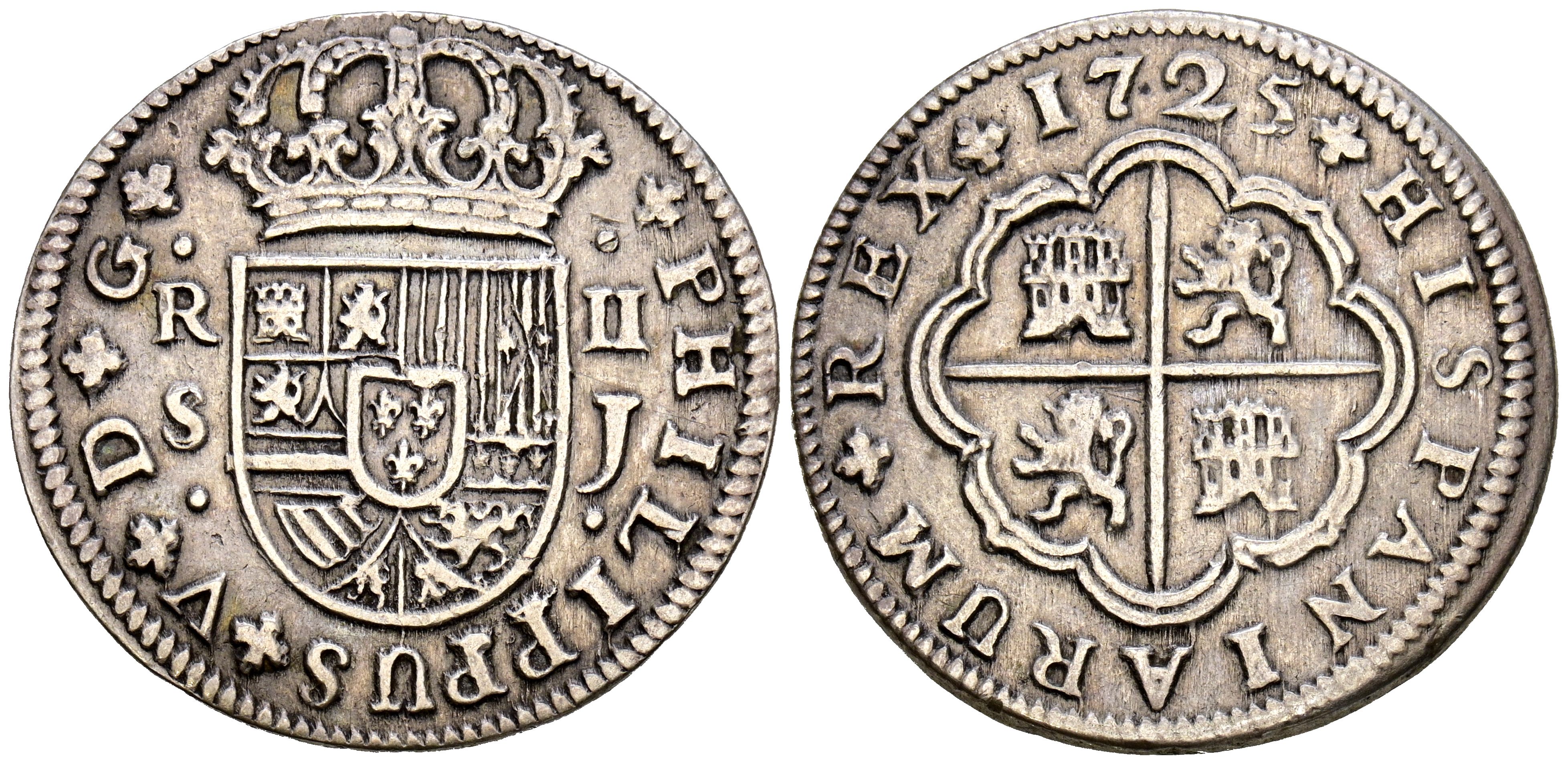 FELIPE V (1700-1746). 2 Reales. (Ar. 5,22g/28mm). 1725. Sevilla J. (Cal-2019-983). MBC+.