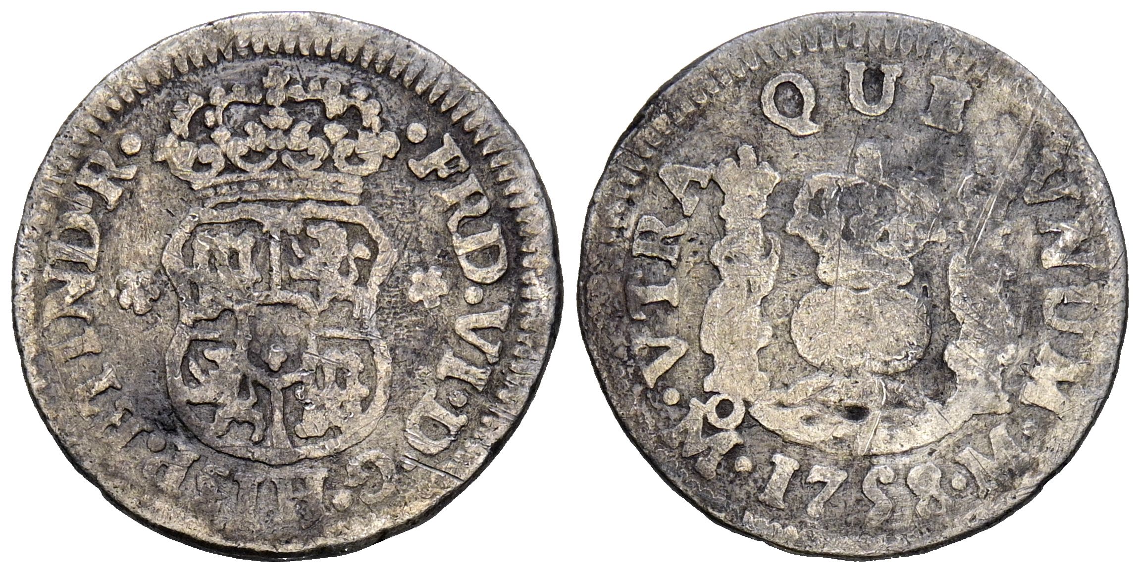 FERNANDO VI (1746-1759). 1/2 Real. (Ar. 1,48g/16mm). 1758. México M. Corona real e imperial sobre columnas. (Cal-2019-97). MBC-.