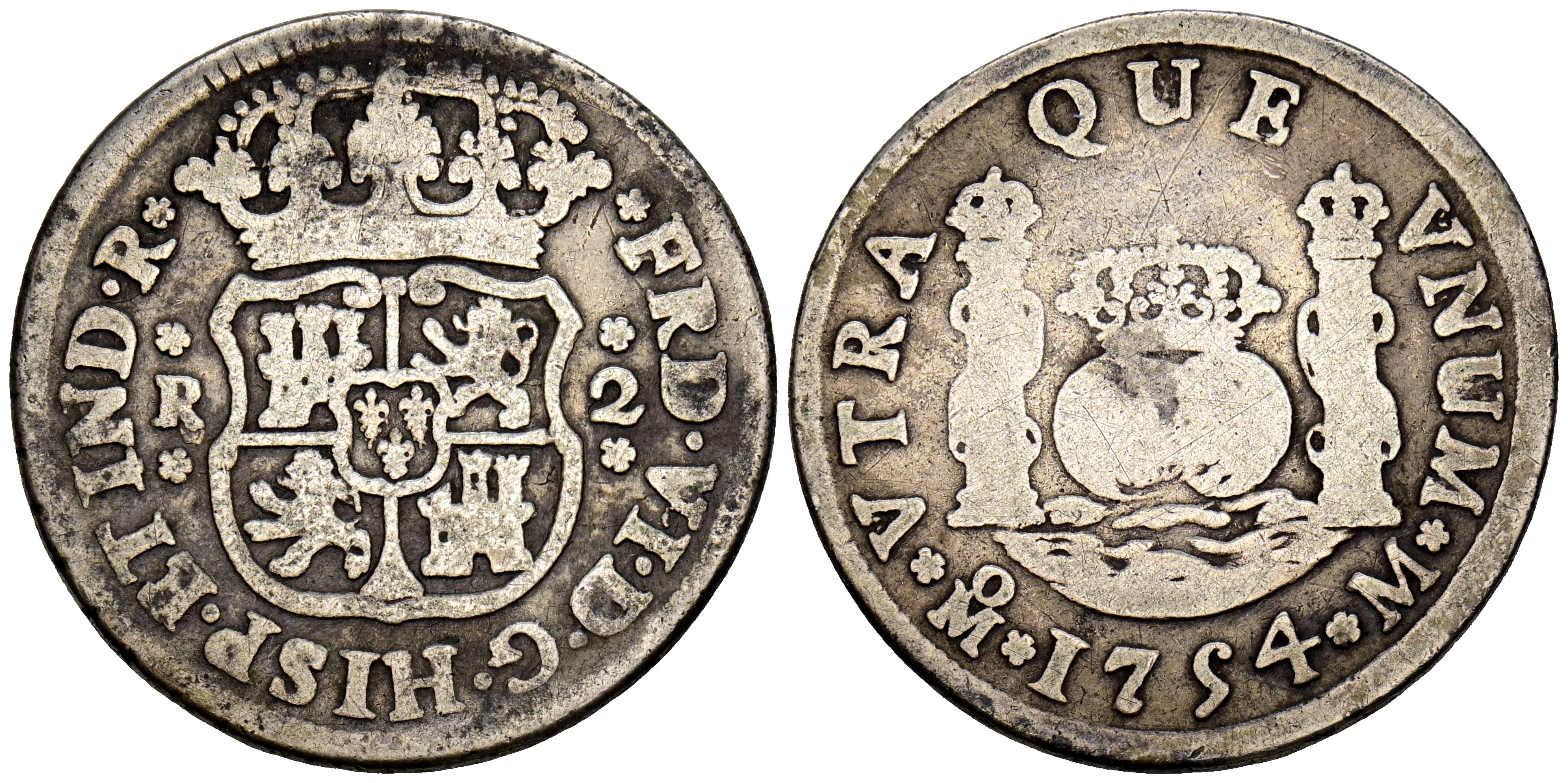 FERNANDO VI (1746-1759). 2 Reales. (Ar. 6,90g/ 27mm). 1754. México M. (Cal-2019-295). BC+.