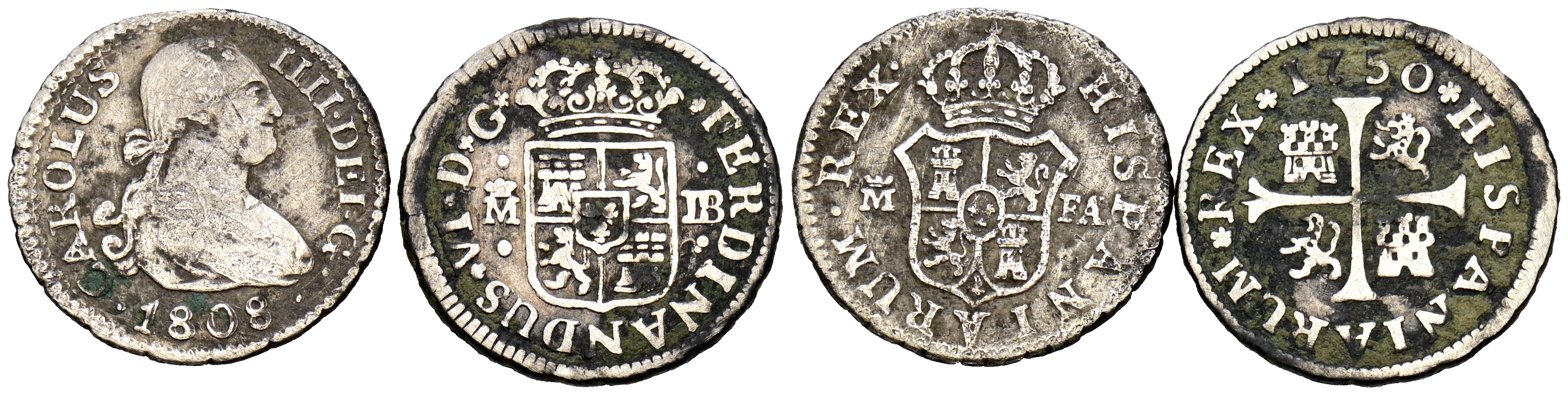 Interesante pareja de 1/2 Reales corespondientes a los reinados de Fernando IV (1750) y Carlos IV (1808) con ceca Madrid. Diferentes estados de conservación. A EXAMINAR.