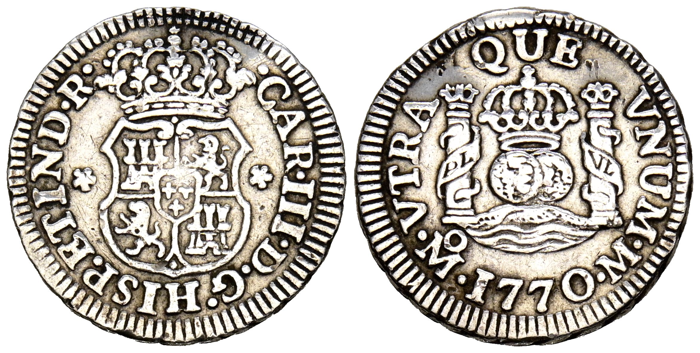 CARLOS III (1759-1788). 1/2 Real. (Ar. 1,66g/16mm). 1770. México M. (Cal-2019-189). MBC+. Limpiada.