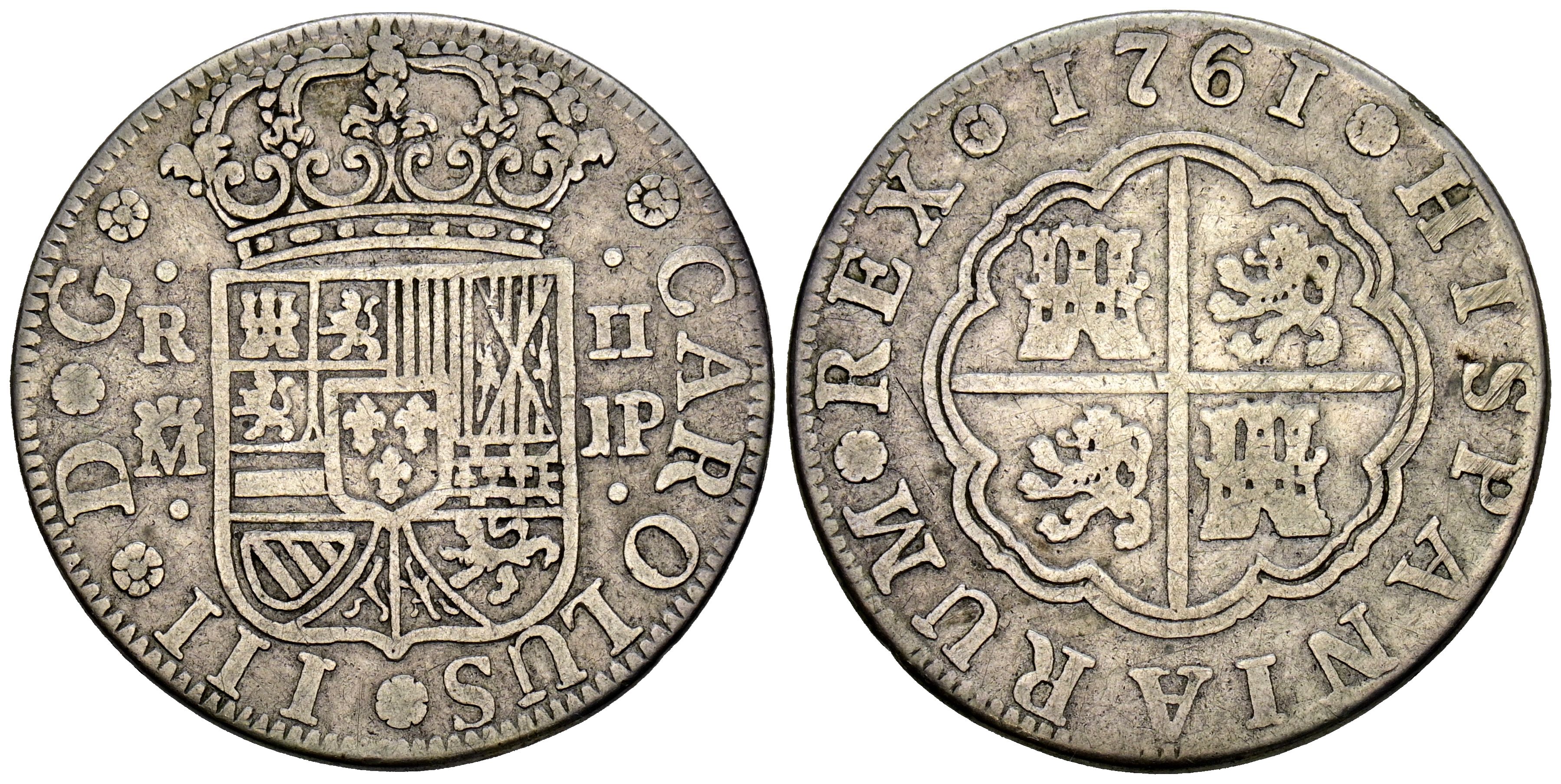 CARLOS III (1759-1788). 2 Reales. (Ar. 5,10g/27mm). 1761. Madrid JP. (Cal-2019-609). MBC-. Acuñación floja.
