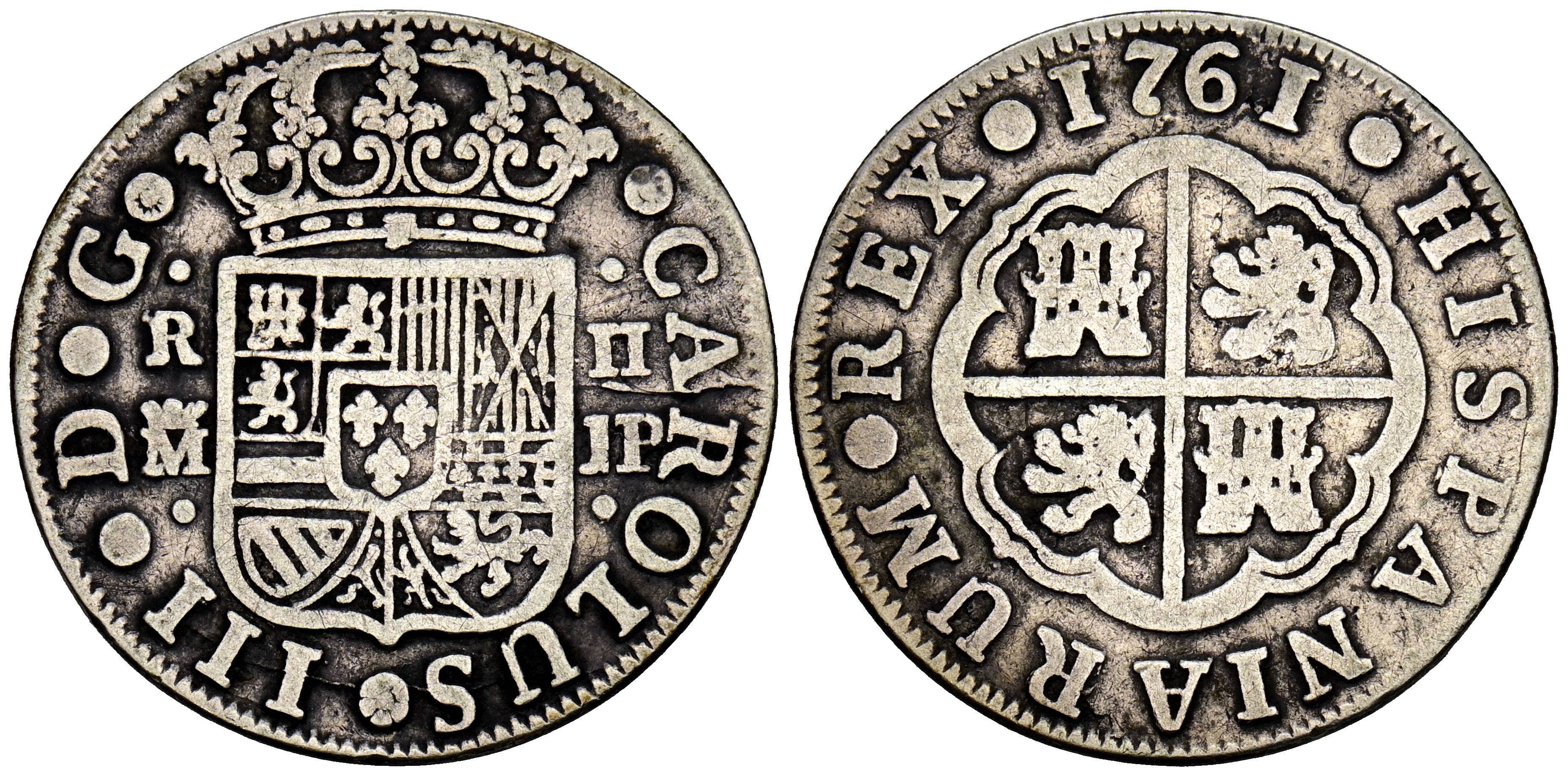 CARLOS III (1759-1788). 2 Reales. (Ar. 5,04g/26mm). 1761. Madrid JP. (Cal-2019-609). BC+.