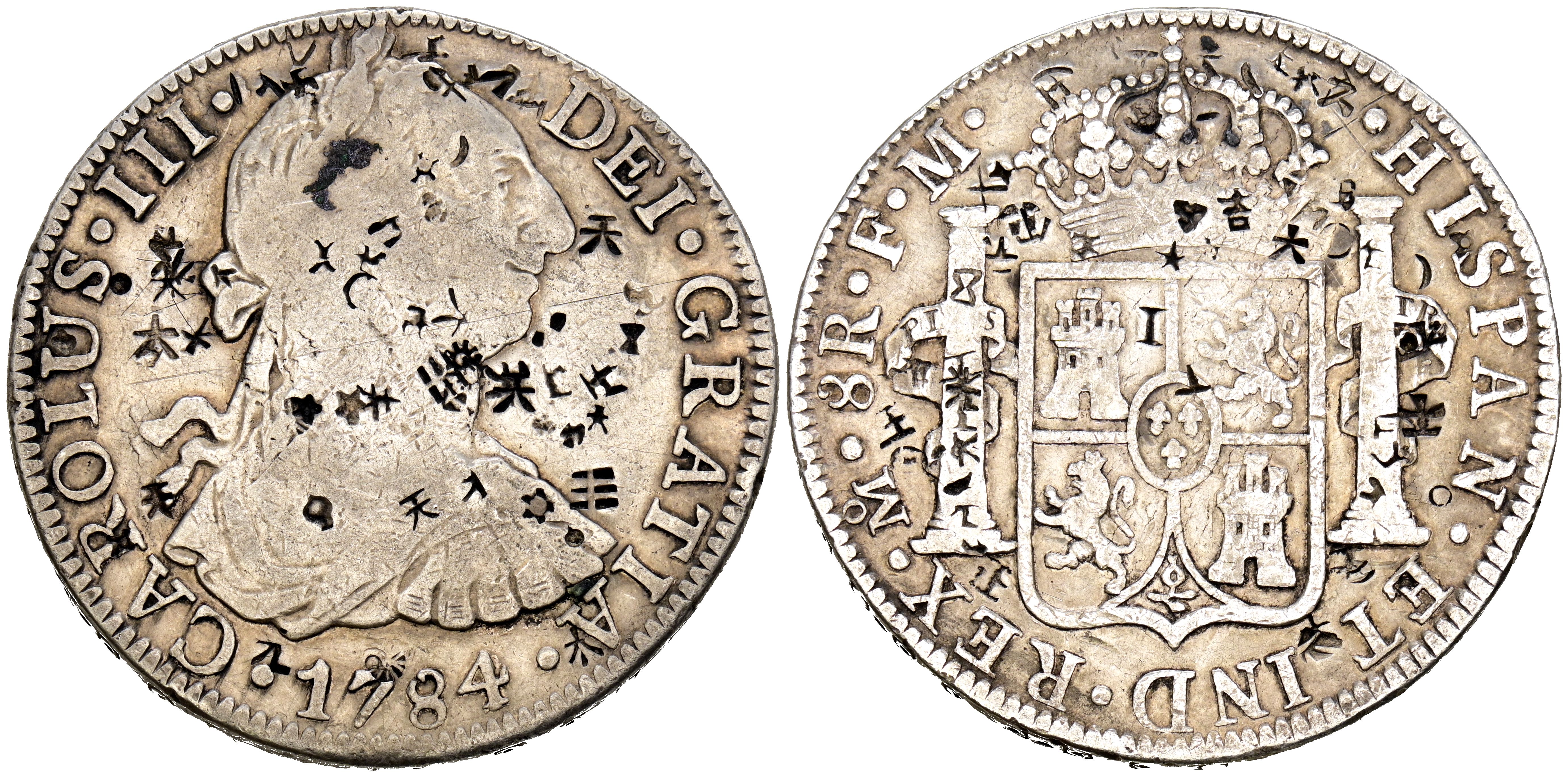 CARLOS III (1759-1788). 8 Reales. (Ar. 26,42g/39mm). 1784. México FM. (Cal-2019-1126). MBC. Resellos orientales.