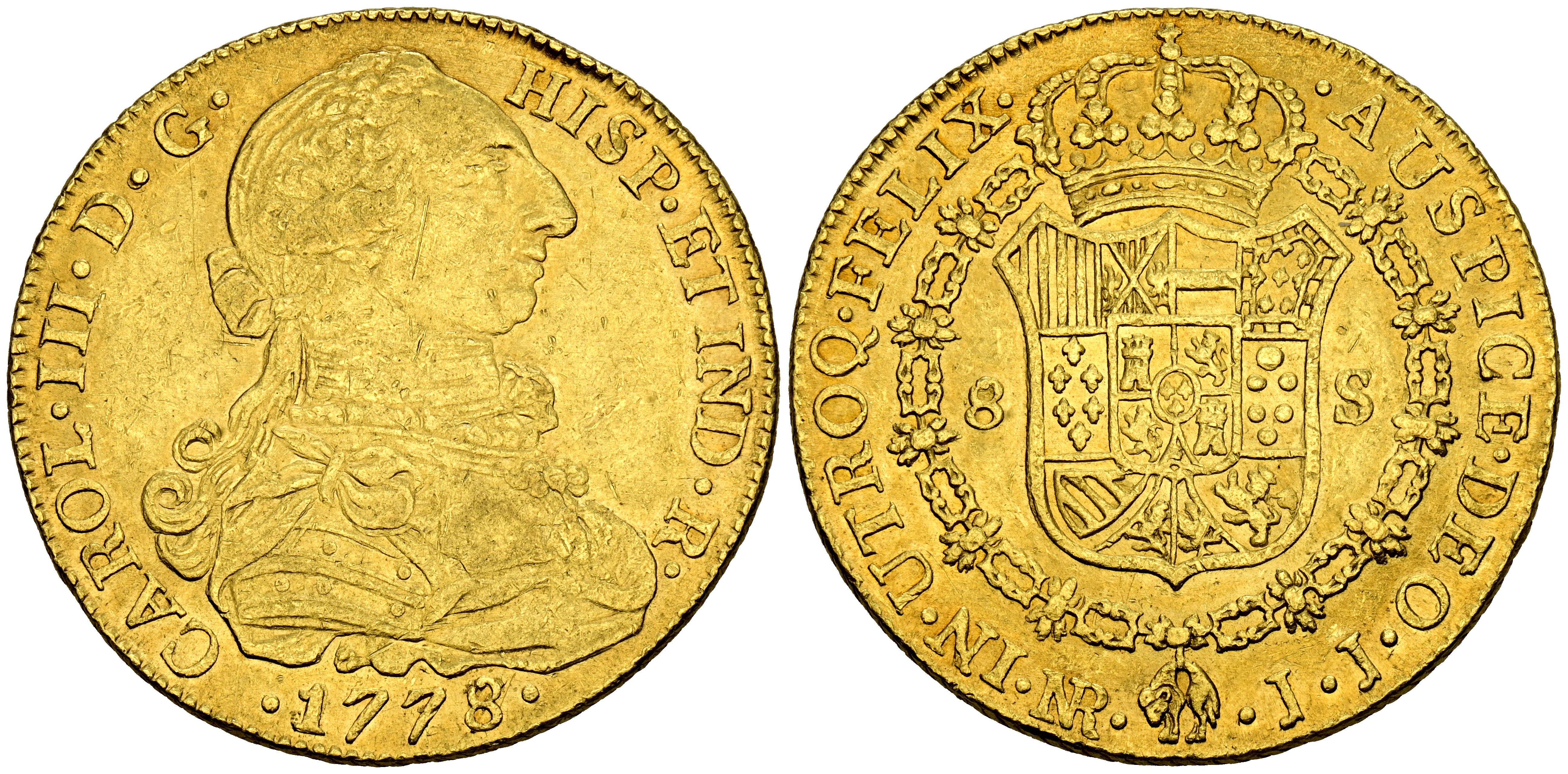 CARLOS III (1759-1788). 8 Escudos. (Au. 26,97g/37mm). 1778/7. Santa Fe de Nuevo Reino JJ. (Cal-2019-2106). MBC+/EBC-. Marquitas.