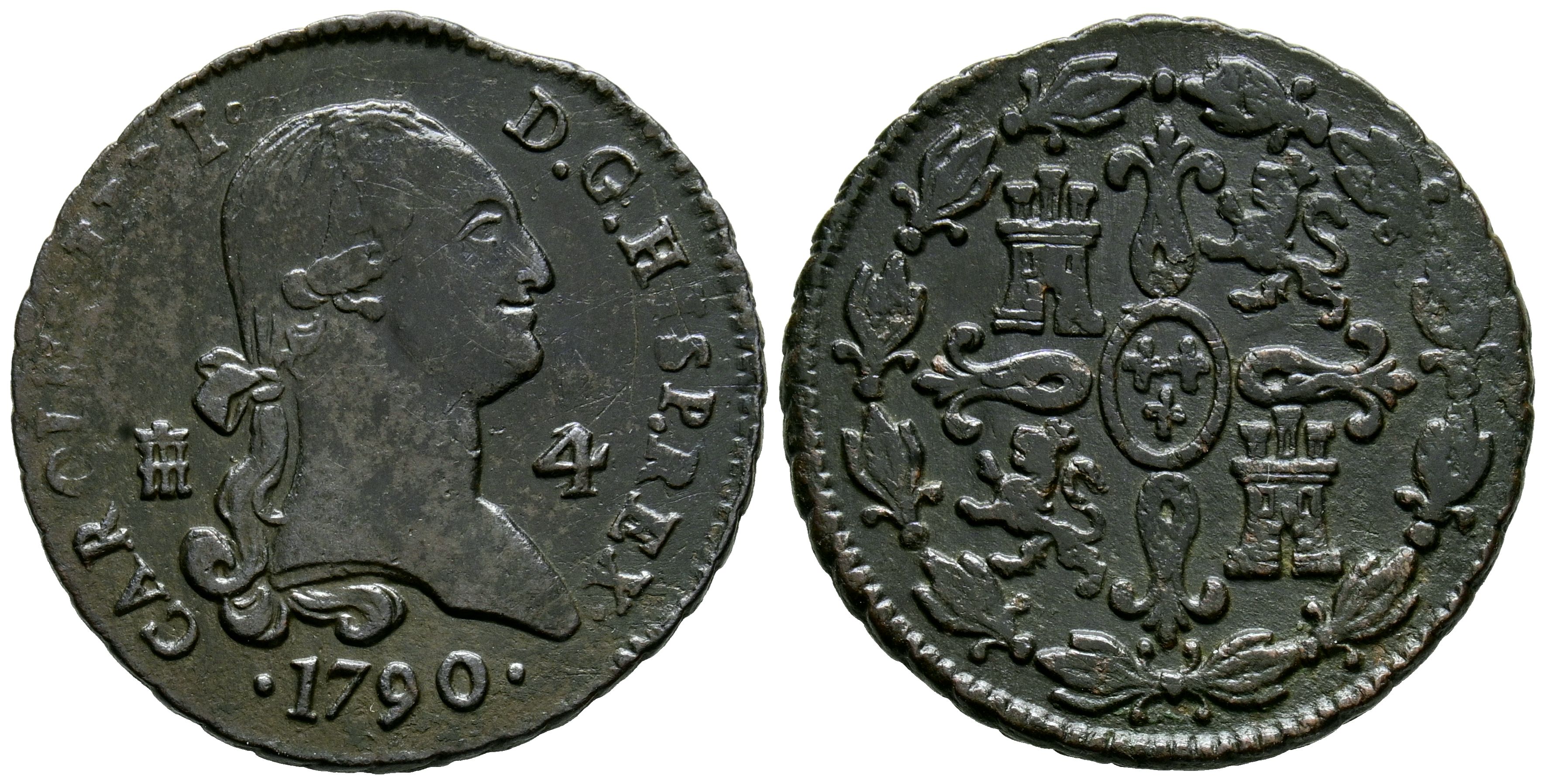 CARLOS IV (1788-1808). 4 Maravedís. (Ae. 5,13g/26mm). 1790. Segovia. (Cal-2019-44). MBC+. Escasa.