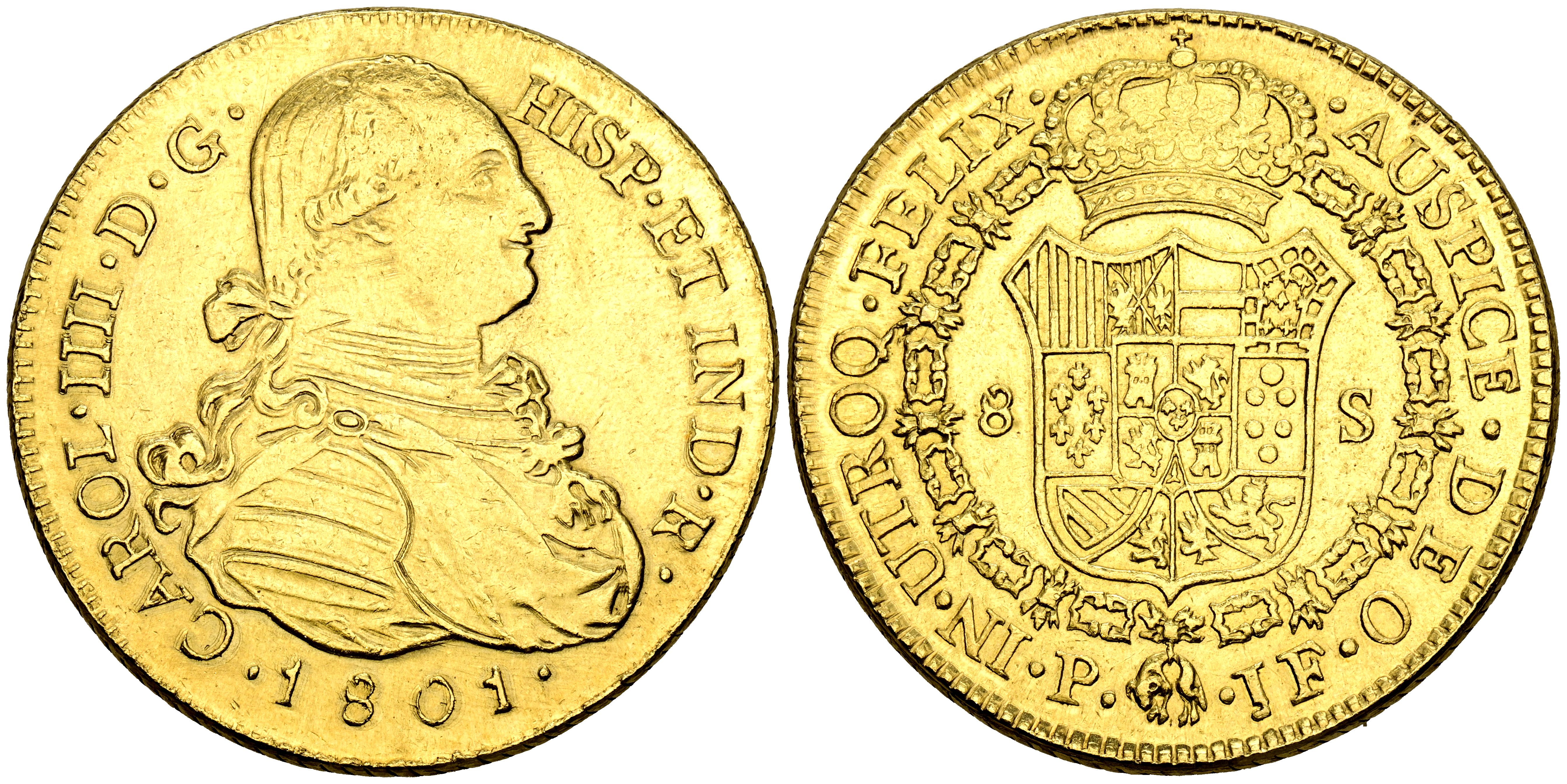 CARLOS IV (1788-1808). 8 Escudos. (Au. 26,61g/38mm). 1801. Popayán JF. (Cal-2019-1674). MBC+. Limpiado.