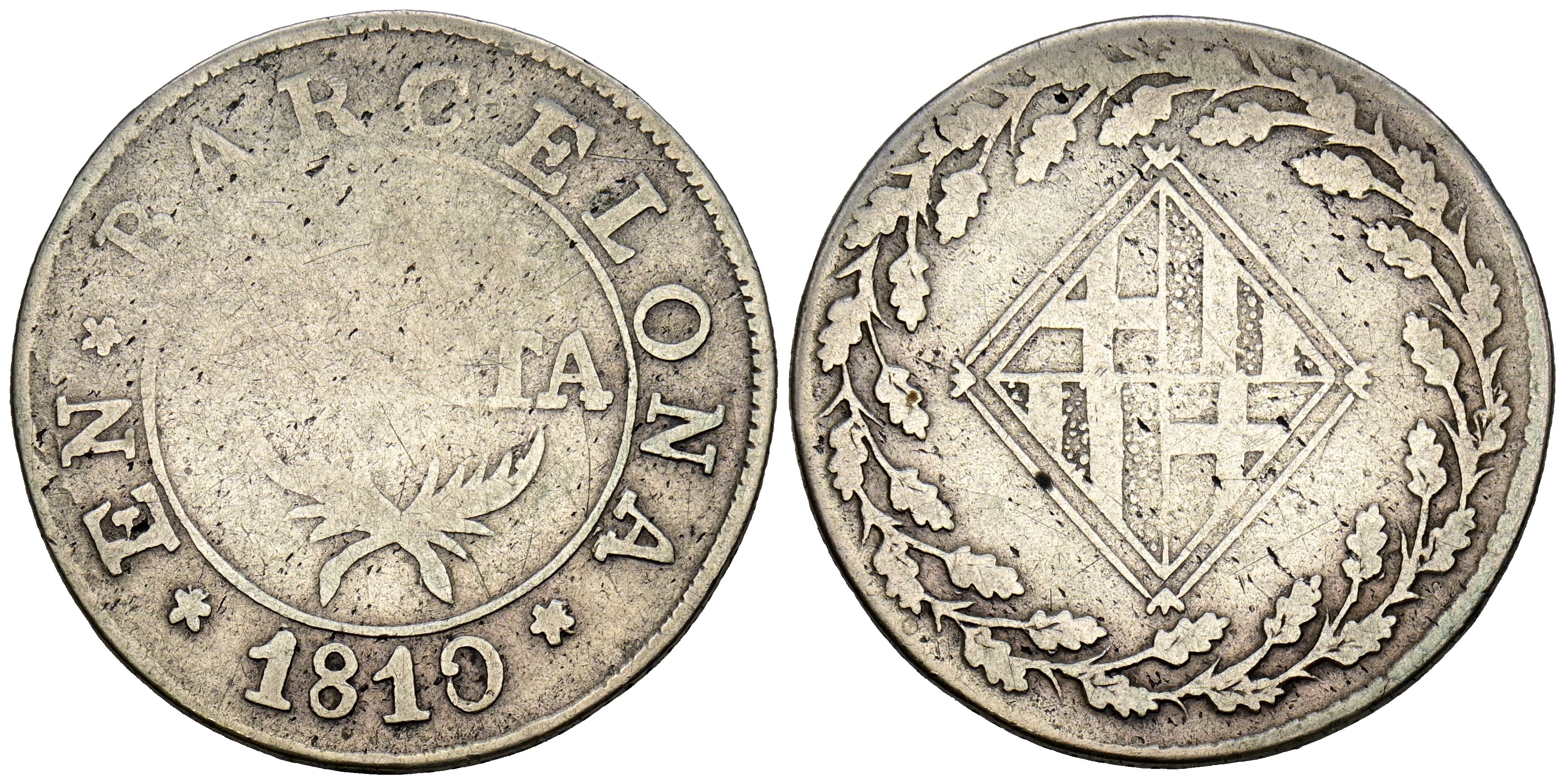 CATALUÑA NAPOLEÓNICA (1808-1814). 1 Peseta. (Ar. 5,11g/26mm). 1810. Barcelona. (Cal-2019-34). BC/BC+.