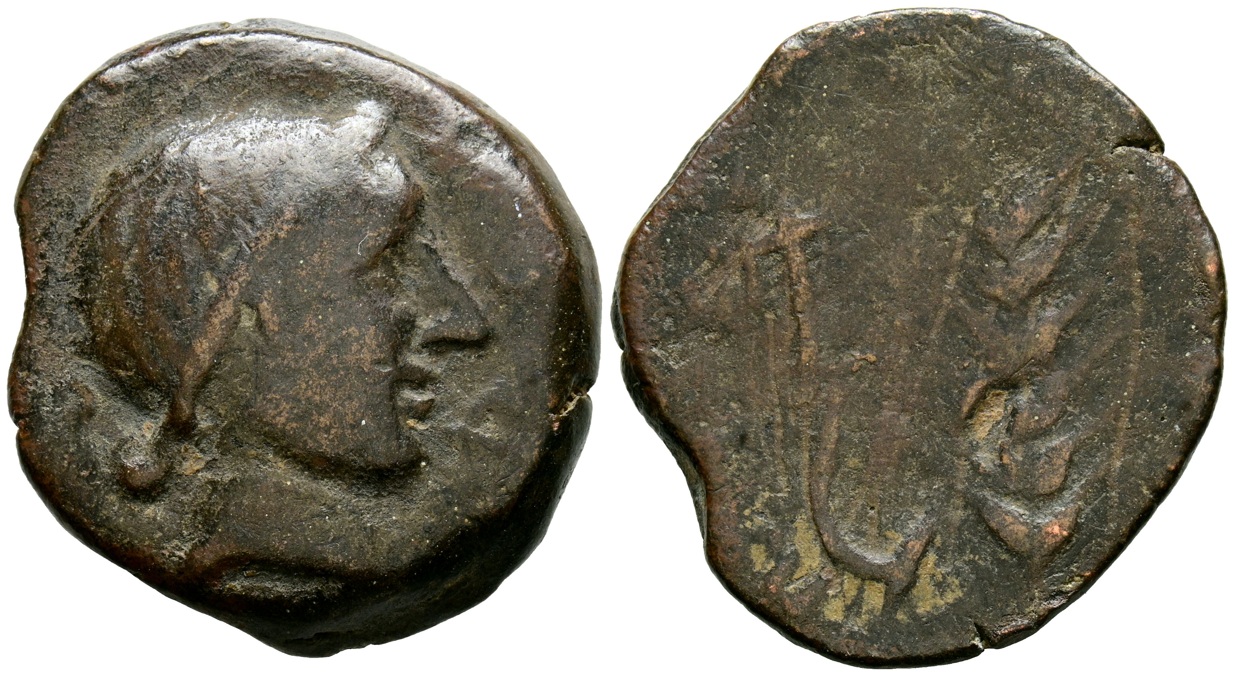 ABRA (Zona de Porcuna, Jaén). As. (Ae. 17,53g/30mm). 120-20 a.C. (FAB-31). Anv: Cabeza femenina a derecha, delante leyenda: ABRA. Rev: Espiga y arado, alrededor leyenda ibérica: TaKiSniS TuBoTuKi. MBC-/BC-. Limpiada. Escasa.