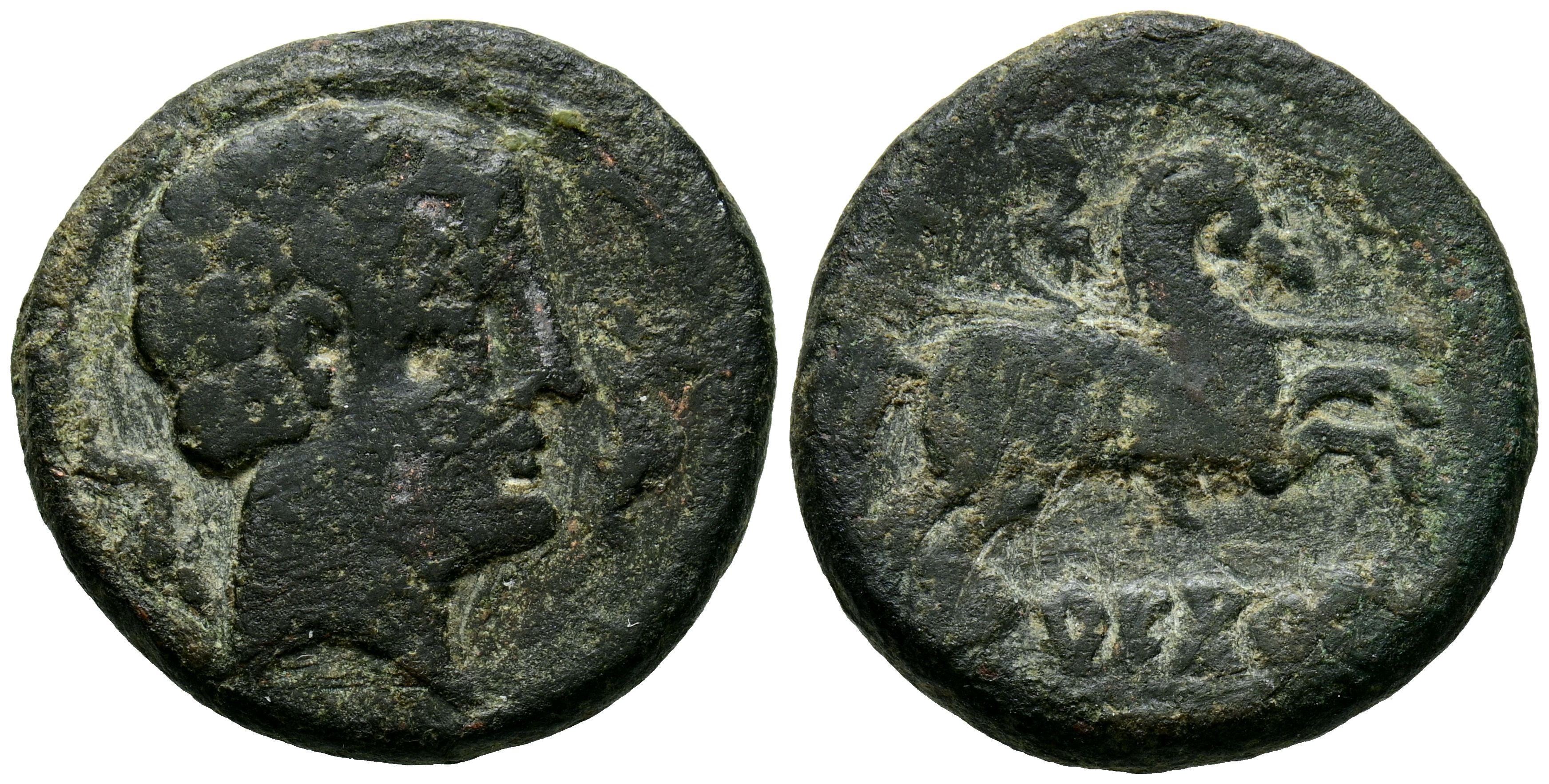 ARECORATAS (Agreda, Soria). As. (Ae. 10,47g/24mm). 150-20 a.C. (FAB-116). Anv: Cabeza masculina a derecha, entre dos delfines. Rev: Jinete con lanza a derecha, debajo leyenda ibérica: ARECoATaS. MBC-.